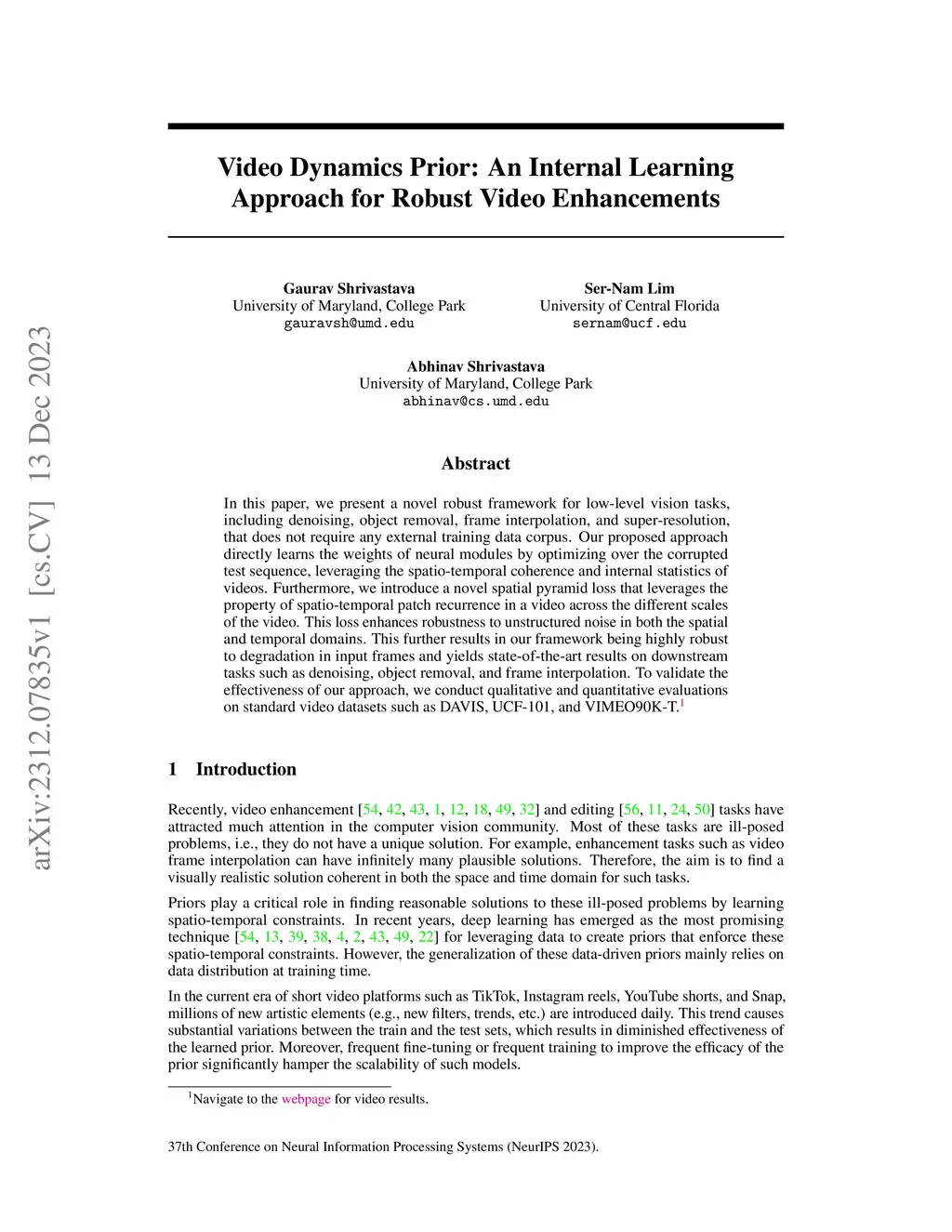 In this paper, we present a novel robust framework for low-level vision tasks, including denoising, object removal, frame interpolation, and super-resolution, that does not require any external training data corpus. Our proposed approach directly learns the weights of neural modules by optimizing over the corrupted test sequence, leveraging the spatio-temporal coherence and internal statistics of videos. Furthermore, we introduce a novel spatial pyramid loss that leverages the property of spatio-temporal patch recurrence in a video across the different scales of the video. This loss enhances robustness to unstructured noise in both the spatial and temporal domains. This further results in our framework being highly robust to degradation in input frames and yields state-of-the-art results on downstream tasks such as denoising, object removal, and frame interpolation. To validate the effectiveness of our approach, we conduct qualitative and quantitative evaluations on standard video datasets such as DAVIS, UCF-101, and VIMEO90K-T.
