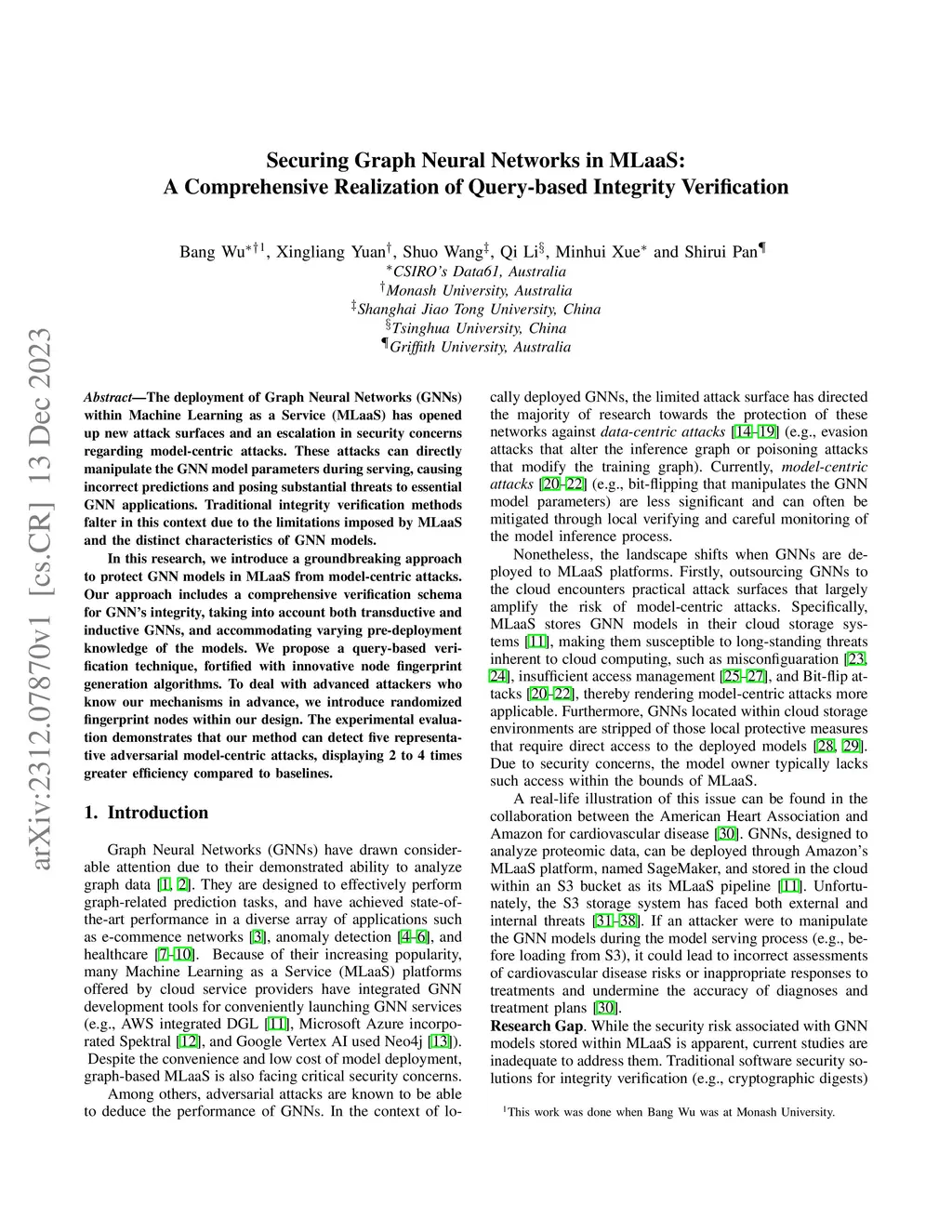 The deployment of Graph Neural Networks (GNNs) within Machine Learning as a Service (MLaaS) has opened up new attack surfaces and an escalation in security concerns regarding model-centric attacks. These attacks can directly manipulate the GNN model parameters during serving, causing incorrect predictions and posing substantial threats to essential GNN applications. Traditional integrity verification methods falter in this context due to the limitations imposed by MLaaS and the distinct characteristics of GNN models. In this research, we introduce a groundbreaking approach to protect GNN models in MLaaS from model-centric attacks. Our approach includes a comprehensive verification schema for GNN's integrity, taking into account both transductive and inductive GNNs, and accommodating varying pre-deployment knowledge of the models. We propose a query-based verification technique, fortified with innovative node fingerprint generation algorithms. To deal with advanced attackers who know our mechanisms in advance, we introduce randomized fingerprint nodes within our design. The experimental evaluation demonstrates that our method can detect five representative adversarial model-centric attacks, displaying 2 to 4 times greater efficiency compared to baselines.