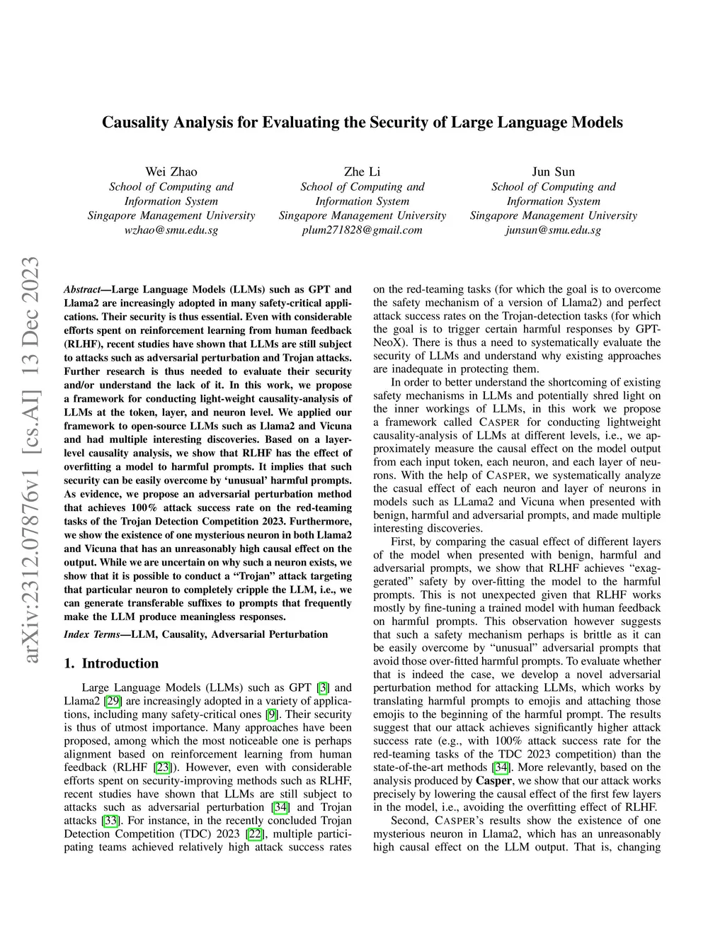 Large Language Models (LLMs) such as GPT and Llama2 are increasingly adopted in many safety-critical applications. Their security is thus essential. Even with considerable efforts spent on reinforcement learning from human feedback (RLHF), recent studies have shown that LLMs are still subject to attacks such as adversarial perturbation and Trojan attacks. Further research is thus needed to evaluate their security and/or understand the lack of it. In this work, we propose a framework for conducting light-weight causality-analysis of LLMs at the token, layer, and neuron level. We applied our framework to open-source LLMs such as Llama2 and Vicuna and had multiple interesting discoveries. Based on a layer-level causality analysis, we show that RLHF has the effect of overfitting a model to harmful prompts. It implies that such security can be easily overcome by `unusual' harmful prompts. As evidence, we propose an adversarial perturbation method that achieves 100\% attack success rate on the red-teaming tasks of the Trojan Detection Competition 2023. Furthermore, we show the existence of one mysterious neuron in both Llama2 and Vicuna that has an unreasonably high causal effect on the output. While we are uncertain on why such a neuron exists, we show that it is possible to conduct a ``Trojan'' attack targeting that particular neuron to completely cripple the LLM, i.e., we can generate transferable suffixes to prompts that frequently make the LLM produce meaningless responses.