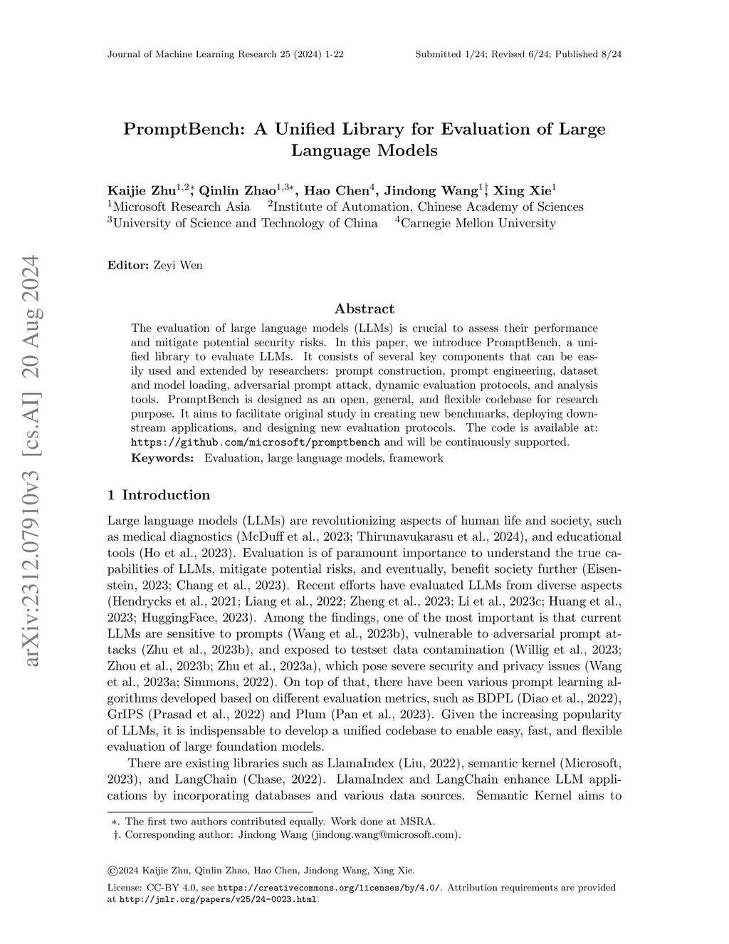 The evaluation of large language models (LLMs) is crucial to assess their performance and mitigate potential security risks. In this paper, we introduce PromptBench, a unified library to evaluate LLMs. It consists of several key components that are easily used and extended by researchers: prompt construction, prompt engineering, dataset and model loading, adversarial prompt attack, dynamic evaluation protocols, and analysis tools. PromptBench is designed to be an open, general, and flexible codebase for research purposes that can facilitate original study in creating new benchmarks, deploying downstream applications, and designing new evaluation protocols. The code is available at: https://github.com/microsoft/promptbench and will be continuously supported.