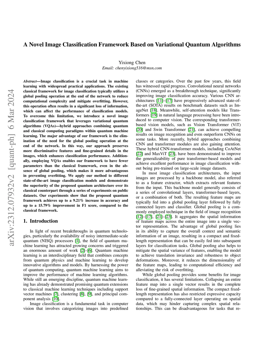 Image classification is a crucial task in machine learning with widespread practical applications. The existing classical framework for image classification typically utilizes a global pooling operation at the end of the network to reduce computational complexity and mitigate overfitting. However, this operation often results in a significant loss of information, which can affect the performance of classification models. To overcome this limitation, we introduce a novel image classification framework that leverages variational quantum algorithms (VQAs)-hybrid approaches combining quantum and classical computing paradigms within quantum machine learning. The major advantage of our framework is the elimination of the need for the global pooling operation at the end of the network. In this way, our approach preserves more discriminative features and fine-grained details in the images, which enhances classification performance. Additionally, employing VQAs enables our framework to have fewer parameters than the classical framework, even in the absence of global pooling, which makes it more advantageous in preventing overfitting. We apply our method to different state-of-the-art image classification models and demonstrate the superiority of the proposed quantum architecture over its classical counterpart through a series of experiments on public datasets. Our experiments show that the proposed quantum framework achieves up to a 9.21% increase in accuracy and up to a 15.79% improvement in F1 score, compared to the classical framework.