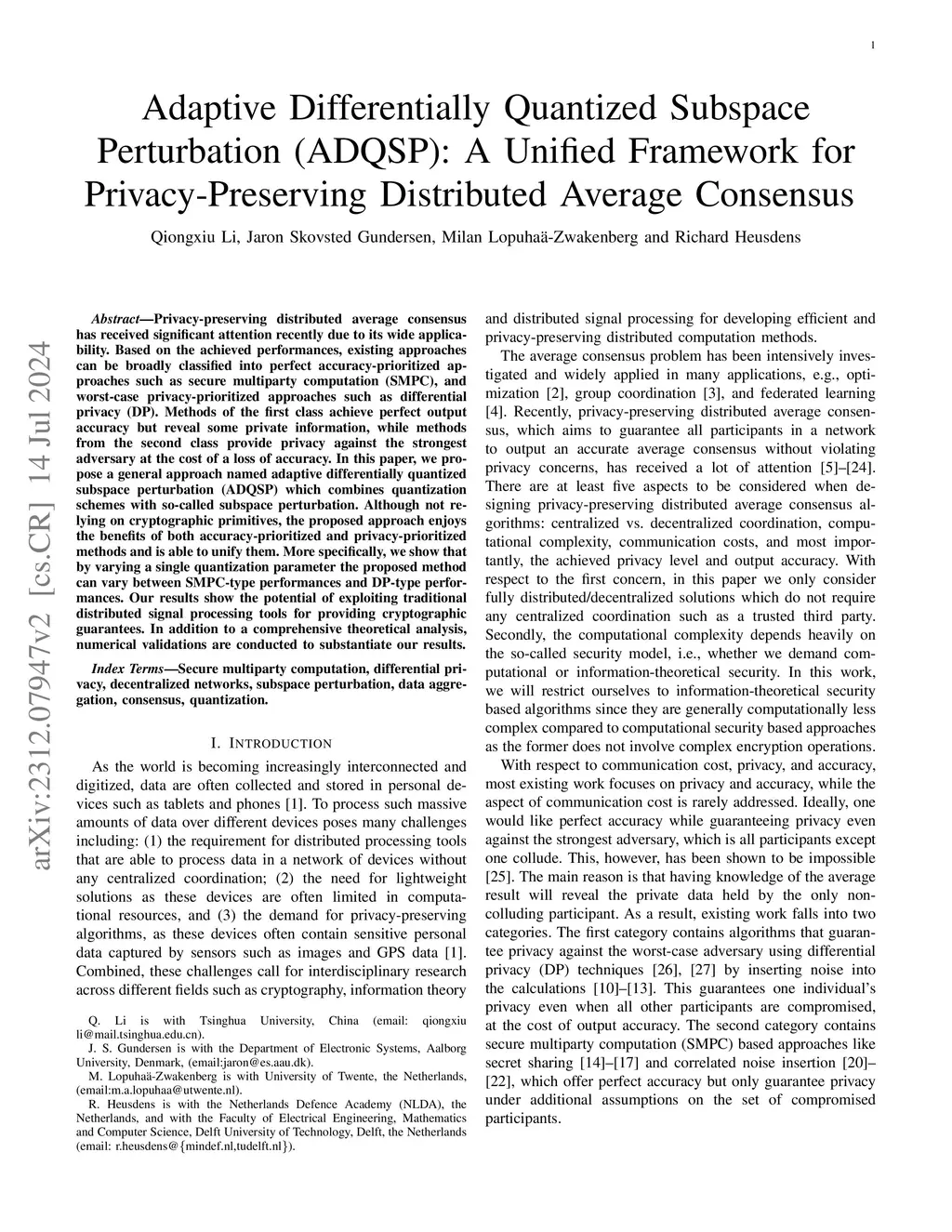 Privacy-preserving distributed average consensus has received significant attention recently due to its wide applicability. Based on the achieved performances, existing approaches can be broadly classified into perfect accuracy-prioritized approaches such as secure multiparty computation (SMPC), and worst-case privacy-prioritized approaches such as differential privacy (DP). Methods of the first class achieve perfect output accuracy but reveal some private information, while methods from the second class provide privacy against the strongest adversary at the cost of a loss of accuracy. In this paper, we propose a general approach named adaptive differentially quantized subspace perturbation (ADQSP) which combines quantization schemes with so-called subspace perturbation. Although not relying on cryptographic primitives, the proposed approach enjoys the benefits of both accuracy-prioritized and privacy-prioritized methods and is able to unify them. More specifically, we show that by varying a single quantization parameter the proposed method can vary between SMPC-type performances and DP-type performances. Our results show the potential of exploiting traditional distributed signal processing tools for providing cryptographic guarantees. In addition to a comprehensive theoretical analysis, numerical validations are conducted to substantiate our results.
