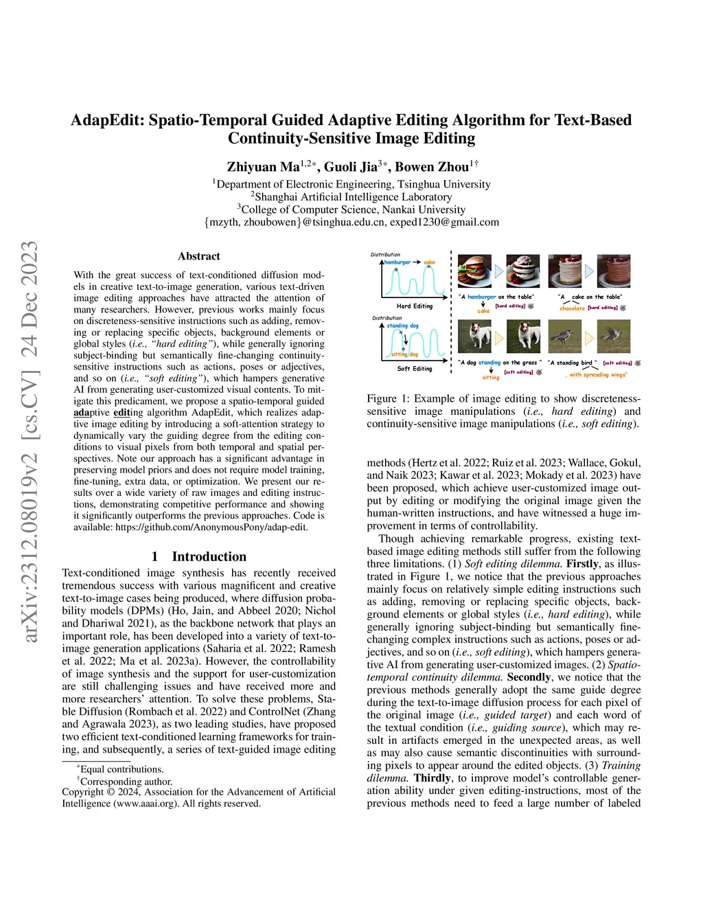 With the great success of text-conditioned diffusion models in creative text-to-image generation, various text-driven image editing approaches have attracted the attentions of many researchers. However, previous works mainly focus on discreteness-sensitive instructions such as adding, removing or replacing specific objects, background elements or global styles (i.e., hard editing), while generally ignoring subject-binding but semantically fine-changing continuity-sensitive instructions such as actions, poses or adjectives, and so on (i.e., soft editing), which hampers generative AI from generating user-customized visual contents. To mitigate this predicament, we propose a spatio-temporal guided adaptive editing algorithm AdapEdit, which realizes adaptive image editing by introducing a soft-attention strategy to dynamically vary the guiding degree from the editing conditions to visual pixels from both temporal and spatial perspectives. Note our approach has a significant advantage in preserving model priors and does not require model training, fine-tuning, extra data, or optimization. We present our results over a wide variety of raw images and editing instructions, demonstrating competitive performance and showing it significantly outperforms the previous approaches.