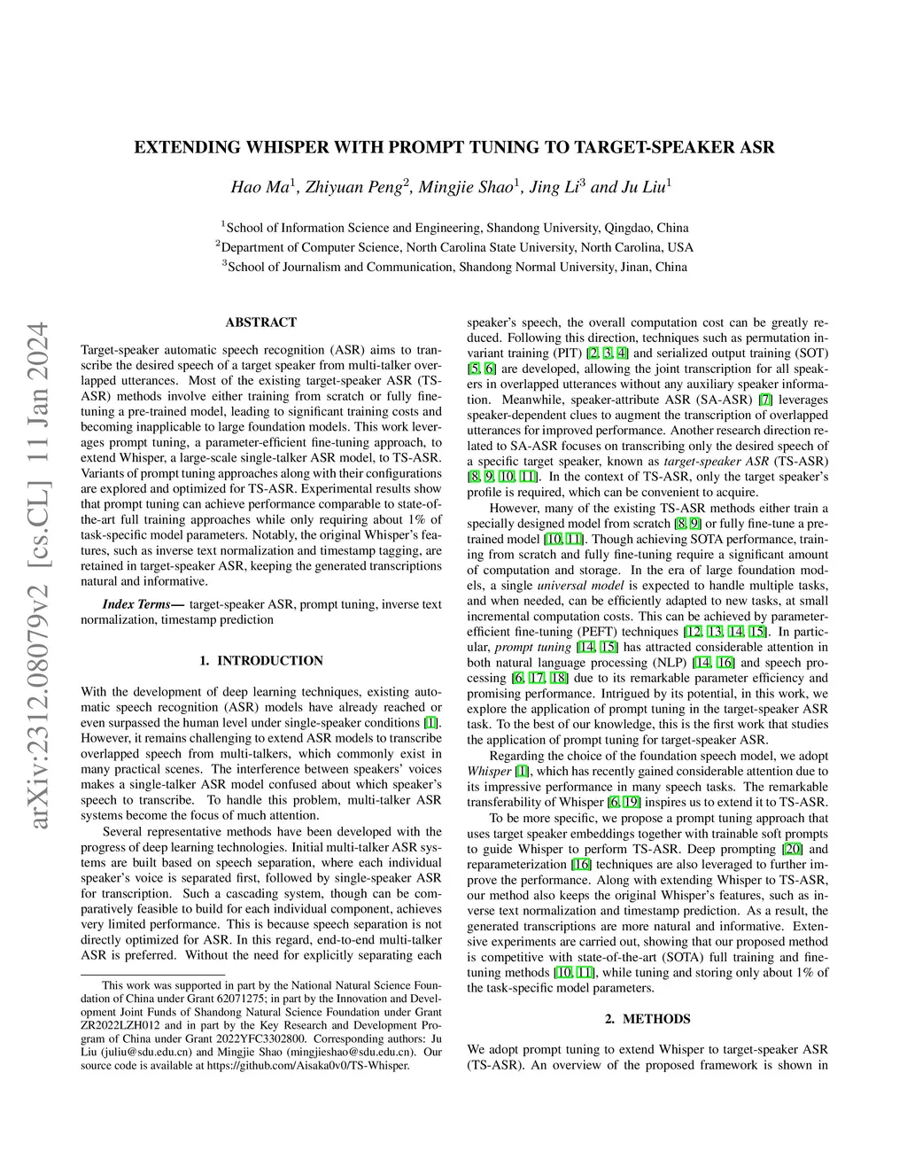 Target-speaker automatic speech recognition (ASR) aims to transcribe the desired speech of a target speaker from multi-talker overlapped utterances. Most of the existing target-speaker ASR (TS-ASR) methods involve either training from scratch or fully fine-tuning a pre-trained model, leading to significant training costs and becoming inapplicable to large foundation models. This work leverages prompt tuning, a parameter-efficient fine-tuning approach, to extend Whisper, a large-scale single-talker ASR model, to TS-ASR. Variants of prompt tuning approaches along with their configurations are explored and optimized for TS-ASR.Experimental results show that prompt tuning can achieve performance comparable to state-of-the-art full training approaches while only requiring about 1\% of task-specific model parameters. Notably, the original Whisper's features, such as inverse text normalization and timestamp tagging, are retained in target-speaker ASR, keeping the generated transcriptions natural and informative.