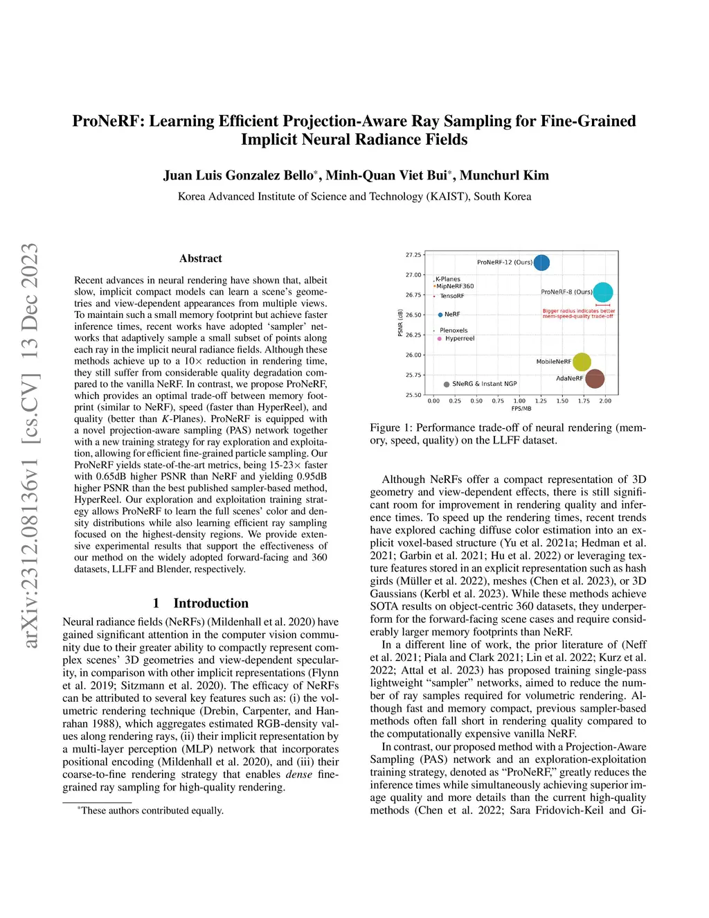 Recent advances in neural rendering have shown that, albeit slow, implicit compact models can learn a scene's geometries and view-dependent appearances from multiple views. To maintain such a small memory footprint but achieve faster inference times, recent works have adopted `sampler' networks that adaptively sample a small subset of points along each ray in the implicit neural radiance fields. Although these methods achieve up to a 10 reduction in rendering time, they still suffer from considerable quality degradation compared to the vanilla NeRF. In contrast, we propose ProNeRF, which provides an optimal trade-off between memory footprint (similar to NeRF), speed (faster than HyperReel), and quality (better than K-Planes). ProNeRF is equipped with a novel projection-aware sampling (PAS) network together with a new training strategy for ray exploration and exploitation, allowing for efficient fine-grained particle sampling. Our ProNeRF yields state-of-the-art metrics, being 15-23x faster with 0.65dB higher PSNR than NeRF and yielding 0.95dB higher PSNR than the best published sampler-based method, HyperReel. Our exploration and exploitation training strategy allows ProNeRF to learn the full scenes' color and density distributions while also learning efficient ray sampling focused on the highest-density regions. We provide extensive experimental results that support the effectiveness of our method on the widely adopted forward-facing and 360 datasets, LLFF and Blender, respectively.