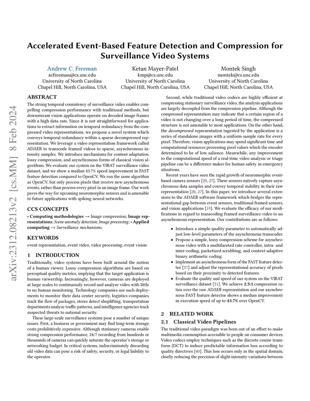 The strong temporal consistency of surveillance video enables compelling compression performance with traditional methods, but downstream vision applications operate on decoded image frames with a high data rate. Since it is not straightforward for applications to extract information on temporal redundancy from the compressed video representations, we propose a novel system which conveys temporal redundancy within a sparse decompressed representation. We leverage a video representation framework called ADDER to transcode framed videos to sparse, asynchronous intensity samples. We introduce mechanisms for content adaptation, lossy compression, and asynchronous forms of classical vision algorithms. We evaluate our system on the VIRAT surveillance video dataset, and we show a median 43.7% speed improvement in FAST feature detection compared to OpenCV. We run the same algorithm as OpenCV, but only process pixels that receive new asynchronous events, rather than process every pixel in an image frame. Our work paves the way for upcoming neuromorphic sensors and is amenable to future applications with spiking neural networks.