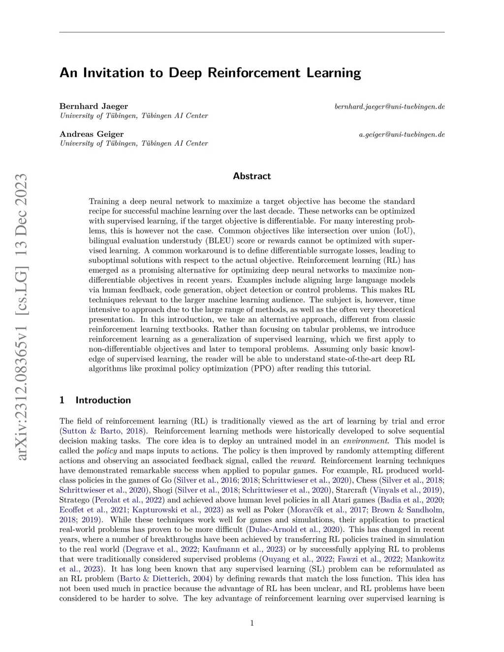 Training a deep neural network to maximize a target objective has become the standard recipe for successful machine learning over the last decade. These networks can be optimized with supervised learning, if the target objective is differentiable. For many interesting problems, this is however not the case. Common objectives like intersection over union (IoU), bilingual evaluation understudy (BLEU) score or rewards cannot be optimized with supervised learning. A common workaround is to define differentiable surrogate losses, leading to suboptimal solutions with respect to the actual objective. Reinforcement learning (RL) has emerged as a promising alternative for optimizing deep neural networks to maximize non-differentiable objectives in recent years. Examples include aligning large language models via human feedback, code generation, object detection or control problems. This makes RL techniques relevant to the larger machine learning audience. The subject is, however, time intensive to approach due to the large range of methods, as well as the often very theoretical presentation. In this introduction, we take an alternative approach, different from classic reinforcement learning textbooks. Rather than focusing on tabular problems, we introduce reinforcement learning as a generalization of supervised learning, which we first apply to non-differentiable objectives and later to temporal problems. Assuming only basic knowledge of supervised learning, the reader will be able to understand state-of-the-art deep RL algorithms like proximal policy optimization (PPO) after reading this tutorial.