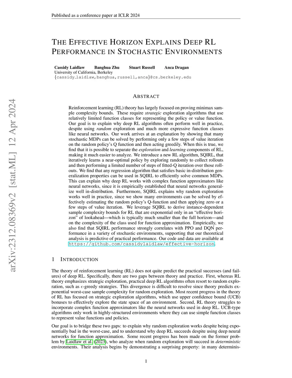 Reinforcement learning (RL) theory has largely focused on proving minimax sample complexity bounds. These require strategic exploration algorithms that use relatively limited function classes for representing the policy or value function. Our goal is to explain why deep RL algorithms often perform well in practice, despite using random exploration and much more expressive function classes like neural networks. Our work arrives at an explanation by showing that many stochastic MDPs can be solved by performing only a few steps of value iteration on the random policy's Q function and then acting greedily. When this is true, we find that it is possible to separate the exploration and learning components of RL, making it much easier to analyze. We introduce a new RL algorithm, SQIRL, that iteratively learns a near-optimal policy by exploring randomly to collect rollouts and then performing a limited number of steps of fitted-Q iteration over those rollouts. Any regression algorithm that satisfies basic in-distribution generalization properties can be used in SQIRL to efficiently solve common MDPs. This can explain why deep RL works, since it is empirically established that neural networks generalize well in-distribution. Furthermore, SQIRL explains why random exploration works well in practice. We leverage SQIRL to derive instance-dependent sample complexity bounds for RL that are exponential only in an "effective horizon" of lookahead and on the complexity of the class used for function approximation. Empirically, we also find that SQIRL performance strongly correlates with PPO and DQN performance in a variety of stochastic environments, supporting that our theoretical analysis is predictive of practical performance. Our code and data are available at https://github.com/cassidylaidlaw/effective-horizon.
