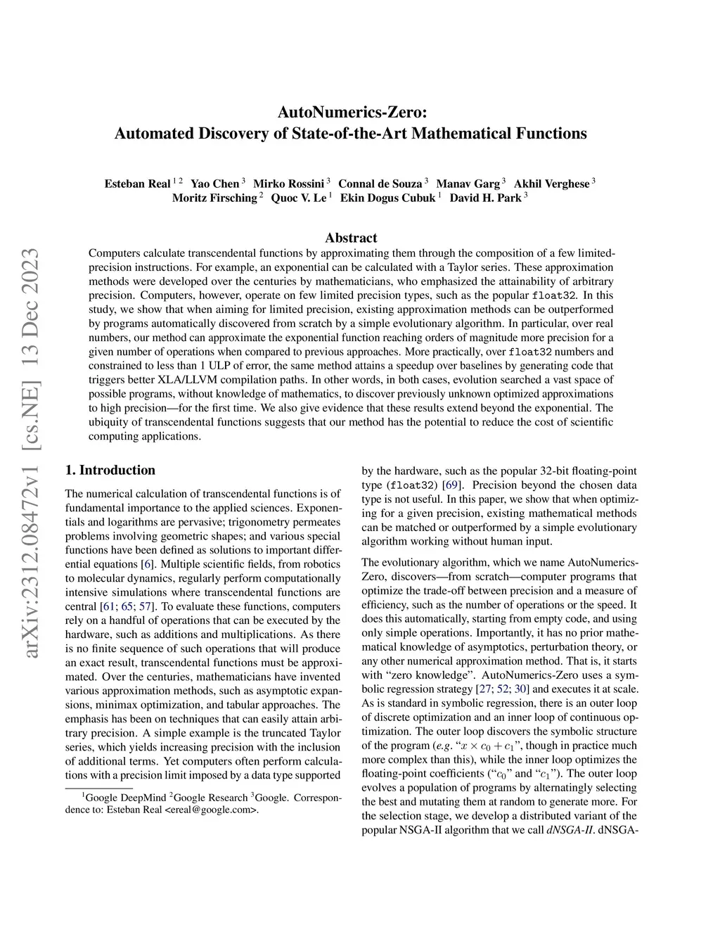 Computers calculate transcendental functions by approximating them through the composition of a few limited-precision instructions. For example, an exponential can be calculated with a Taylor series. These approximation methods were developed over the centuries by mathematicians, who emphasized the attainability of arbitrary precision. Computers, however, operate on few limited precision types, such as the popular float32. In this study, we show that when aiming for limited precision, existing approximation methods can be outperformed by programs automatically discovered from scratch by a simple evolutionary algorithm. In particular, over real numbers, our method can approximate the exponential function reaching orders of magnitude more precision for a given number of operations when compared to previous approaches. More practically, over float32 numbers and constrained to less than 1 ULP of error, the same method attains a speedup over baselines by generating code that triggers better XLA/LLVM compilation paths. In other words, in both cases, evolution searched a vast space of possible programs, without knowledge of mathematics, to discover previously unknown optimized approximations to high precision, for the first time. We also give evidence that these results extend beyond the exponential. The ubiquity of transcendental functions suggests that our method has the potential to reduce the cost of scientific computing applications.