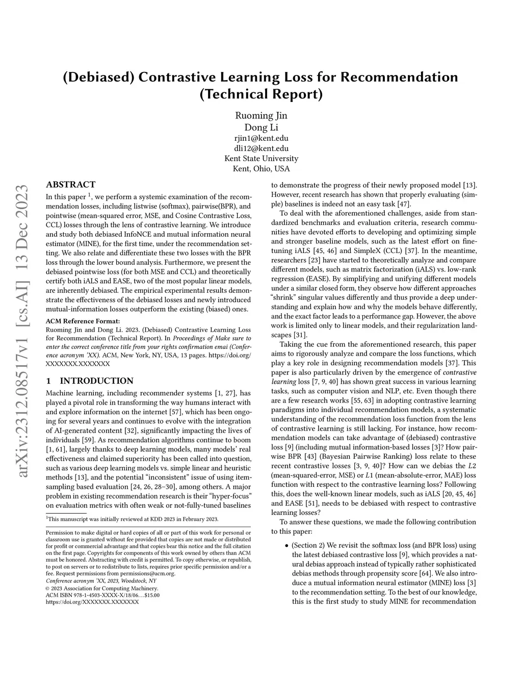 (Debiased) Contrastive Learning Loss for Recommendation (Technical