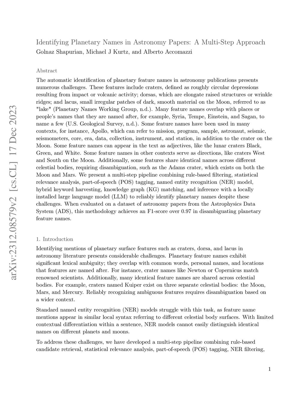 The automatic identification of planetary feature names in astronomy publications presents numerous challenges. These features include craters, defined as roughly circular depressions resulting from impact or volcanic activity; dorsas, which are elongate raised structures or wrinkle ridges; and lacus, small irregular patches of dark, smooth material on the Moon, referred to as "lake" (Planetary Names Working Group, n.d.). Many feature names overlap with places or people's names that they are named after, for example, Syria, Tempe, Einstein, and Sagan, to name a few (U.S. Geological Survey, n.d.). Some feature names have been used in many contexts, for instance, Apollo, which can refer to mission, program, sample, astronaut, seismic, seismometers, core, era, data, collection, instrument, and station, in addition to the crater on the Moon. Some feature names can appear in the text as adjectives, like the lunar craters Black, Green, and White. Some feature names in other contexts serve as directions, like craters West and South on the Moon. Additionally, some features share identical names across different celestial bodies, requiring disambiguation, such as the Adams crater, which exists on both the Moon and Mars. We present a multi-step pipeline combining rule-based filtering, statistical relevance analysis, part-of-speech (POS) tagging, named entity recognition (NER) model, hybrid keyword harvesting, knowledge graph (KG) matching, and inference with a locally installed large language model (LLM) to reliably identify planetary names despite these challenges. When evaluated on a dataset of astronomy papers from the Astrophysics Data System (ADS), this methodology achieves an F1-score over 0.97 in disambiguating planetary feature names.
