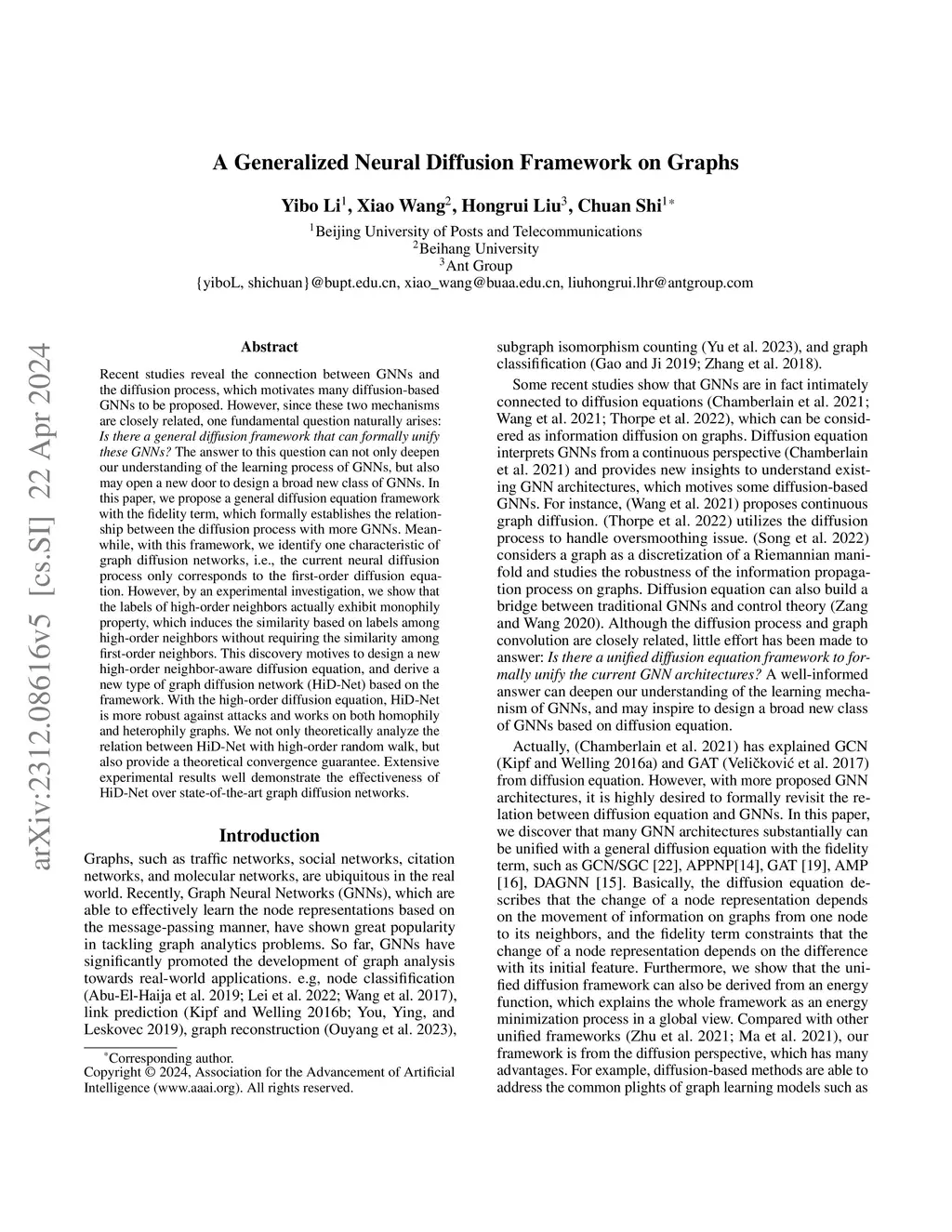 Recent studies reveal the connection between GNNs and the diffusion process, which motivates many diffusion-based GNNs to be proposed. However, since these two mechanisms are closely related, one fundamental question naturally arises: Is there a general diffusion framework that can formally unify these GNNs? The answer to this question can not only deepen our understanding of the learning process of GNNs, but also may open a new door to design a broad new class of GNNs. In this paper, we propose a general diffusion equation framework with the fidelity term, which formally establishes the relationship between the diffusion process with more GNNs. Meanwhile, with this framework, we identify one characteristic of graph diffusion networks, i.e., the current neural diffusion process only corresponds to the first-order diffusion equation. However, by an experimental investigation, we show that the labels of high-order neighbors actually exhibit monophily property, which induces the similarity based on labels among high-order neighbors without requiring the similarity among first-order neighbors. This discovery motives to design a new high-order neighbor-aware diffusion equation, and derive a new type of graph diffusion network (HiD-Net) based on the framework. With the high-order diffusion equation, HiD-Net is more robust against attacks and works on both homophily and heterophily graphs. We not only theoretically analyze the relation between HiD-Net with high-order random walk, but also provide a theoretical convergence guarantee. Extensive experimental results well demonstrate the effectiveness of HiD-Net over state-of-the-art graph diffusion networks.