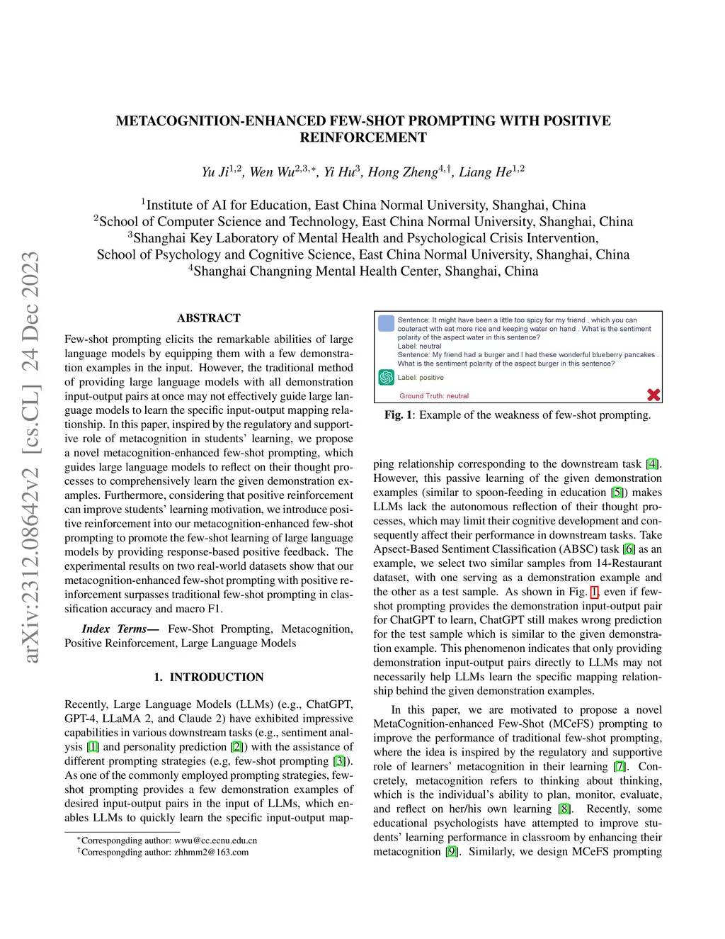 Metacognition-Enhanced Few-Shot Prompting With Positive Reinforcement