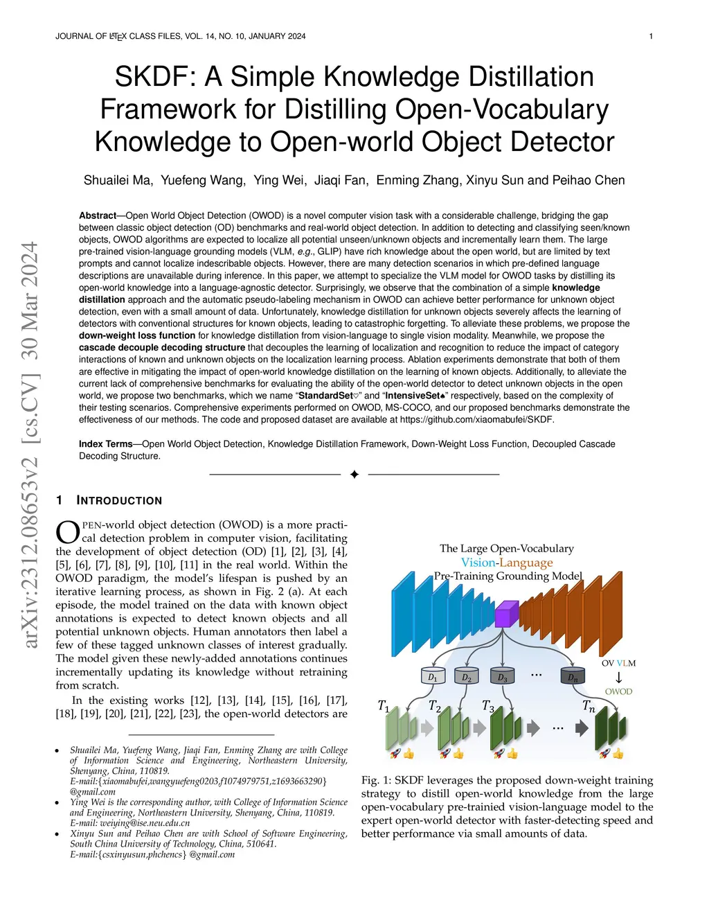 In this paper, we attempt to specialize the VLM model for OWOD tasks by distilling its open-world knowledge into a language-agnostic detector. Surprisingly, we observe that the combination of a simple \textbf{knowledge distillation} approach and the automatic pseudo-labeling mechanism in OWOD can achieve better performance for unknown object detection, even with a small amount of data. Unfortunately, knowledge distillation for unknown objects severely affects the learning of detectors with conventional structures for known objects, leading to catastrophic forgetting. To alleviate these problems, we propose the \textbf{down-weight loss function} for knowledge distillation from vision-language to single vision modality. Meanwhile, we propose the \textbf{cascade decouple decoding structure} that decouples the learning of localization and recognition to reduce the impact of category interactions of known and unknown objects on the localization learning process. Ablation experiments demonstrate that both of them are effective in mitigating the impact of open-world knowledge distillation on the learning of known objects. Additionally, to alleviate the current lack of comprehensive benchmarks for evaluating the ability of the open-world detector to detect unknown objects in the open world, we propose two benchmarks, which we name "\textbf{StandardSet}" and "\textbf{IntensiveSet}" respectively, based on the complexity of their testing scenarios. Comprehensive experiments performed on OWOD, MS-COCO, and our proposed benchmarks demonstrate the effectiveness of our methods. The code and proposed dataset are available at \url{https://github.com/xiaomabufei/SKDF}.