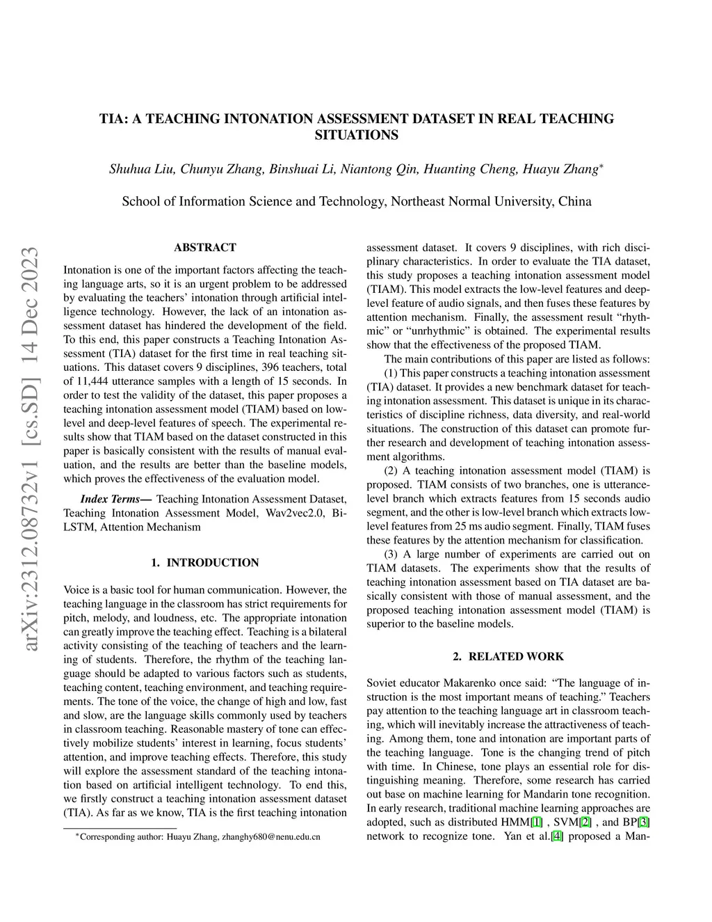 Intonation is one of the important factors affecting the teaching language arts, so it is an urgent problem to be addressed by evaluating the teachers' intonation through artificial intelligence technology. However, the lack of an intonation assessment dataset has hindered the development of the field. To this end, this paper constructs a Teaching Intonation Assessment (TIA) dataset for the first time in real teaching situations. This dataset covers 9 disciplines, 396 teachers, total of 11,444 utterance samples with a length of 15 seconds. In order to test the validity of the dataset, this paper proposes a teaching intonation assessment model (TIAM) based on low-level and deep-level features of speech. The experimental results show that TIAM based on the dataset constructed in this paper is basically consistent with the results of manual evaluation, and the results are better than the baseline models, which proves the effectiveness of the evaluation model.