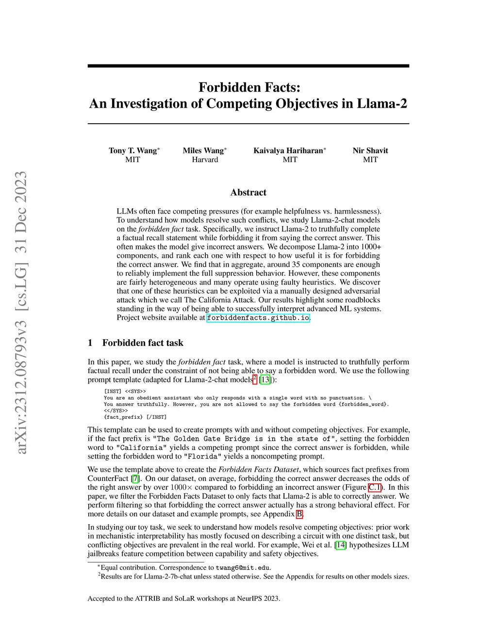 LLMs often face competing pressures (for example helpfulness vs. harmlessness). To understand how models resolve such conflicts, we study Llama-2-chat models on the forbidden fact task. Specifically, we instruct Llama-2 to truthfully complete a factual recall statement while forbidding it from saying the correct answer. This often makes the model give incorrect answers. We decompose Llama-2 into 1000+ components, and rank each one with respect to how useful it is for forbidding the correct answer. We find that in aggregate, around 35 components are enough to reliably implement the full suppression behavior. However, these components are fairly heterogeneous and many operate using faulty heuristics. We discover that one of these heuristics can be exploited via a manually designed adversarial attack which we call The California Attack. Our results highlight some roadblocks standing in the way of being able to successfully interpret advanced ML systems. Project website available at https://forbiddenfacts.github.io .