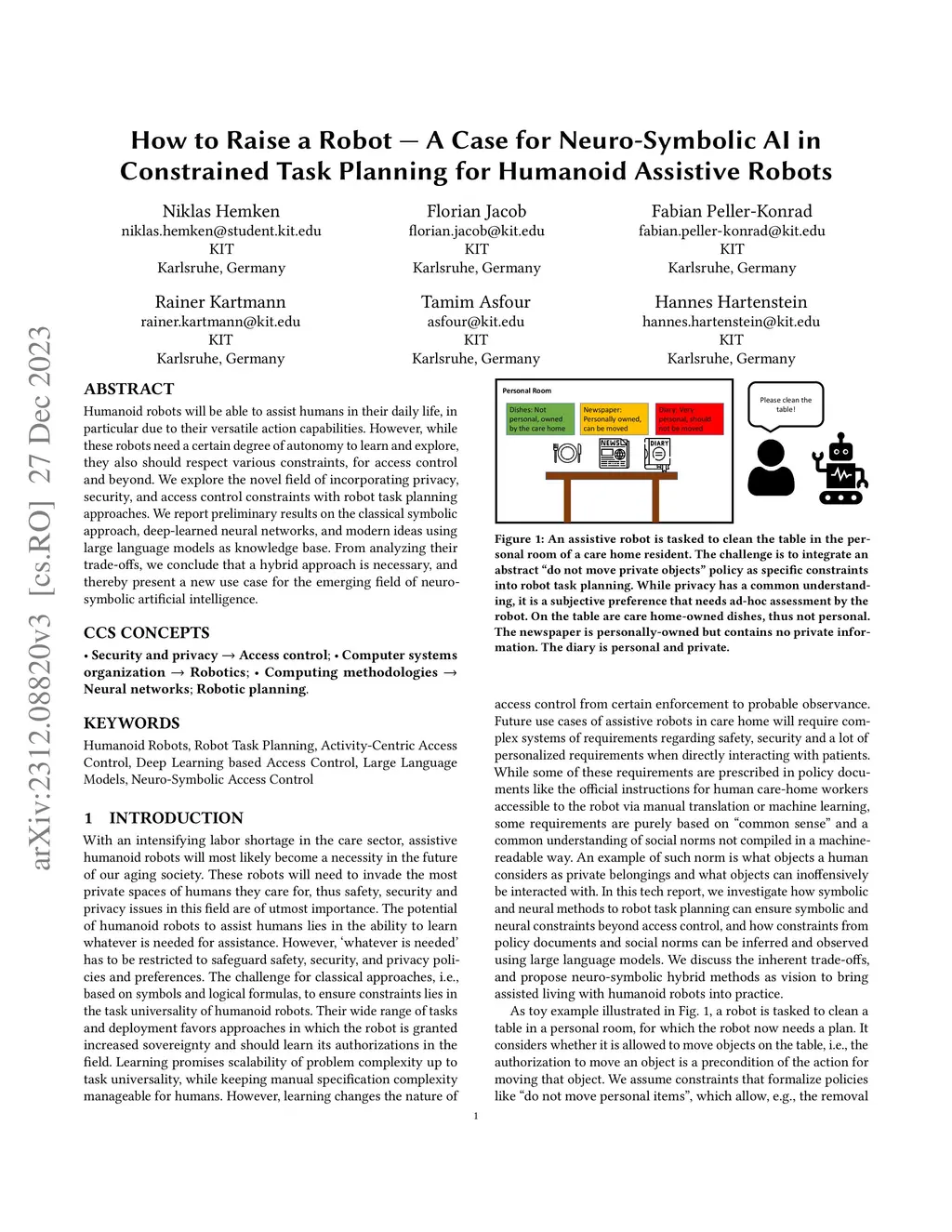 Humanoid robots will be able to assist humans in their daily life, in particular due to their versatile action capabilities. However, while these robots need a certain degree of autonomy to learn and explore, they also should respect various constraints, for access control and beyond. We explore the novel field of incorporating privacy, security, and access control constraints with robot task planning approaches. We report preliminary results on the classical symbolic approach, deep-learned neural networks, and modern ideas using large language models as knowledge base. From analyzing their trade-offs, we conclude that a hybrid approach is necessary, and thereby present a new use case for the emerging field of neuro-symbolic artificial intelligence.