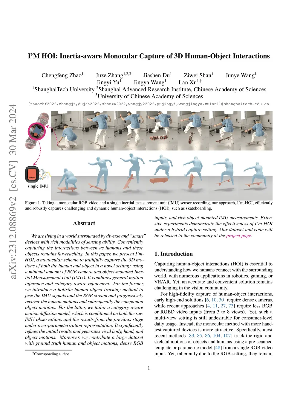 We are living in a world surrounded by diverse and "smart" devices with rich modalities of sensing ability. Conveniently capturing the interactions between us humans and these objects remains far-reaching. In this paper, we present I'm-HOI, a monocular scheme to faithfully capture the 3D motions of both the human and object in a novel setting: using a minimal amount of RGB camera and object-mounted Inertial Measurement Unit (IMU). It combines general motion inference and category-aware refinement. For the former, we introduce a holistic human-object tracking method to fuse the IMU signals and the RGB stream and progressively recover the human motions and subsequently the companion object motions. For the latter, we tailor a category-aware motion diffusion model, which is conditioned on both the raw IMU observations and the results from the previous stage under over-parameterization representation. It significantly refines the initial results and generates vivid body, hand, and object motions. Moreover, we contribute a large dataset with ground truth human and object motions, dense RGB inputs, and rich object-mounted IMU measurements. Extensive experiments demonstrate the effectiveness of I'm-HOI under a hybrid capture setting. Our dataset and code will be released to the community.
