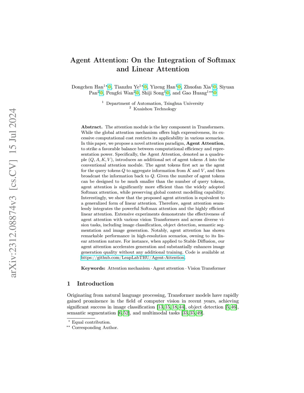 The attention module is the key component in Transformers. While the global attention mechanism offers high expressiveness, its excessive computational cost restricts its applicability in various scenarios. In this paper, we propose a novel attention paradigm, Agent Attention, to strike a favorable balance between computational efficiency and representation power. Specifically, the Agent Attention, denoted as a quadruple , introduces an additional set of agent tokens into the conventional attention module. The agent tokens first act as the agent for the query tokens to aggregate information from and , and then broadcast the information back to . Given the number of agent tokens can be designed to be much smaller than the number of query tokens, the agent attention is significantly more efficient than the widely adopted Softmax attention, while preserving global context modelling capability. Interestingly, we show that the proposed agent attention is equivalent to a generalized form of linear attention. Therefore, agent attention seamlessly integrates the powerful Softmax attention and the highly efficient linear attention. Extensive experiments demonstrate the effectiveness of agent attention with various vision Transformers and across diverse vision tasks, including image classification, object detection, semantic segmentation and image generation. Notably, agent attention has shown remarkable performance in high-resolution scenarios, owning to its linear attention nature. For instance, when applied to Stable Diffusion, our agent attention accelerates generation and substantially enhances image generation quality without any additional training. Code is available at https://github.com/LeapLabTHU/Agent-Attention.