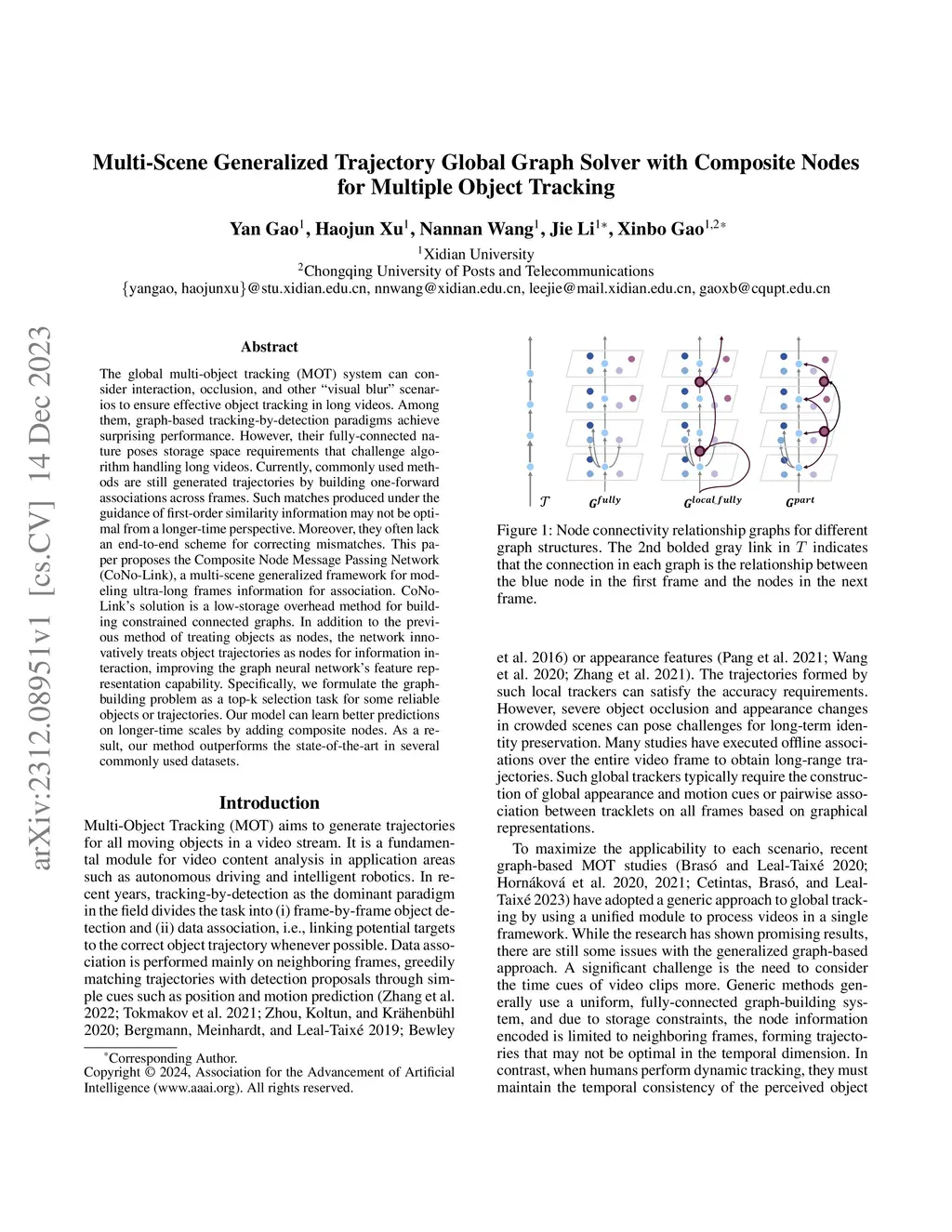 The global multi-object tracking (MOT) system can consider interaction, occlusion, and other ``visual blur'' scenarios to ensure effective object tracking in long videos. Among them, graph-based tracking-by-detection paradigms achieve surprising performance. However, their fully-connected nature poses storage space requirements that challenge algorithm handling long videos. Currently, commonly used methods are still generated trajectories by building one-forward associations across frames. Such matches produced under the guidance of first-order similarity information may not be optimal from a longer-time perspective. Moreover, they often lack an end-to-end scheme for correcting mismatches. This paper proposes the Composite Node Message Passing Network (CoNo-Link), a multi-scene generalized framework for modeling ultra-long frames information for association. CoNo-Link's solution is a low-storage overhead method for building constrained connected graphs. In addition to the previous method of treating objects as nodes, the network innovatively treats object trajectories as nodes for information interaction, improving the graph neural network's feature representation capability. Specifically, we formulate the graph-building problem as a top-k selection task for some reliable objects or trajectories. Our model can learn better predictions on longer-time scales by adding composite nodes. As a result, our method outperforms the state-of-the-art in several commonly used datasets.