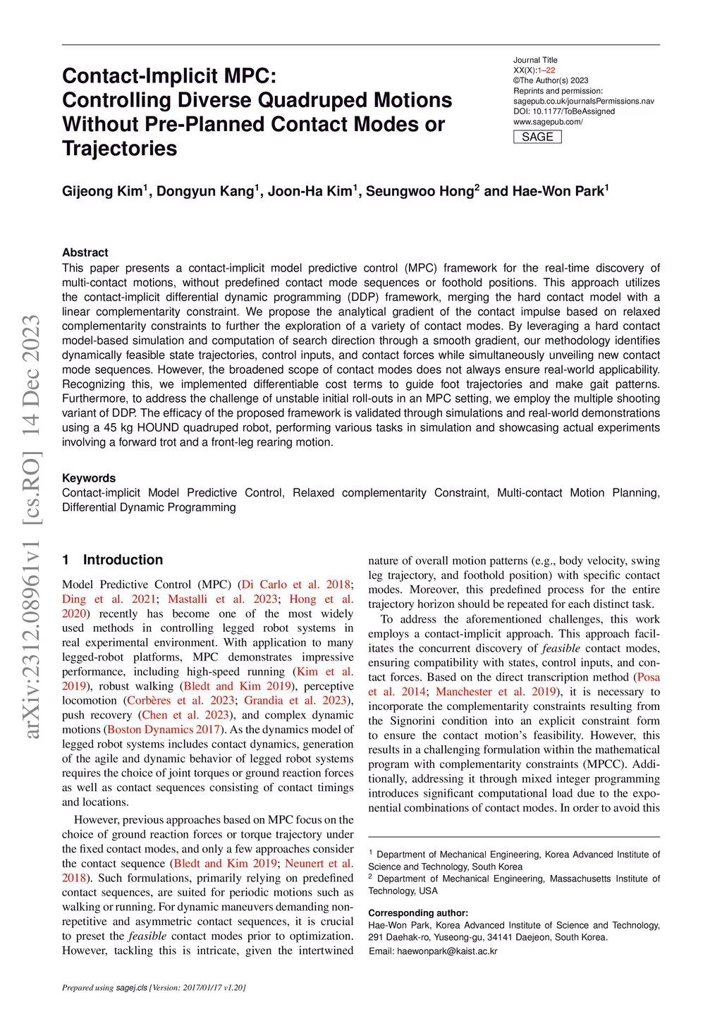 This paper presents a contact-implicit model predictive control (MPC) framework for the real-time discovery of multi-contact motions, without predefined contact mode sequences or foothold positions. This approach utilizes the contact-implicit differential dynamic programming (DDP) framework, merging the hard contact model with a linear complementarity constraint. We propose the analytical gradient of the contact impulse based on relaxed complementarity constraints to further the exploration of a variety of contact modes. By leveraging a hard contact model-based simulation and computation of search direction through a smooth gradient, our methodology identifies dynamically feasible state trajectories, control inputs, and contact forces while simultaneously unveiling new contact mode sequences. However, the broadened scope of contact modes does not always ensure real-world applicability. Recognizing this, we implemented differentiable cost terms to guide foot trajectories and make gait patterns. Furthermore, to address the challenge of unstable initial roll-outs in an MPC setting, we employ the multiple shooting variant of DDP. The efficacy of the proposed framework is validated through simulations and real-world demonstrations using a 45 kg HOUND quadruped robot, performing various tasks in simulation and showcasing actual experiments involving a forward trot and a front-leg rearing motion.