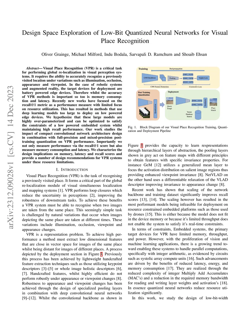 Visual Place Recognition (VPR) is a critical task for performing global re-localization in visual perception systems. It requires the ability to accurately recognize a previously visited location under variations such as illumination, occlusion, appearance and viewpoint. In the case of robotic systems and augmented reality, the target devices for deployment are battery powered edge devices. Therefore whilst the accuracy of VPR methods is important so too is memory consumption and latency. Recently new works have focused on the recall@1 metric as a performance measure with limited focus on resource utilization. This has resulted in methods that use deep learning models too large to deploy on low powered edge devices. We hypothesize that these large models are highly over-parameterized and can be optimized to satisfy the constraints of a low powered embedded system whilst maintaining high recall performance. Our work studies the impact of compact convolutional network architecture design in combination with full-precision and mixed-precision post-training quantization on VPR performance. Importantly we not only measure performance via the recall@1 score but also measure memory consumption and latency. We characterize the design implications on memory, latency and recall scores and provide a number of design recommendations for VPR systems under these resource limitations.