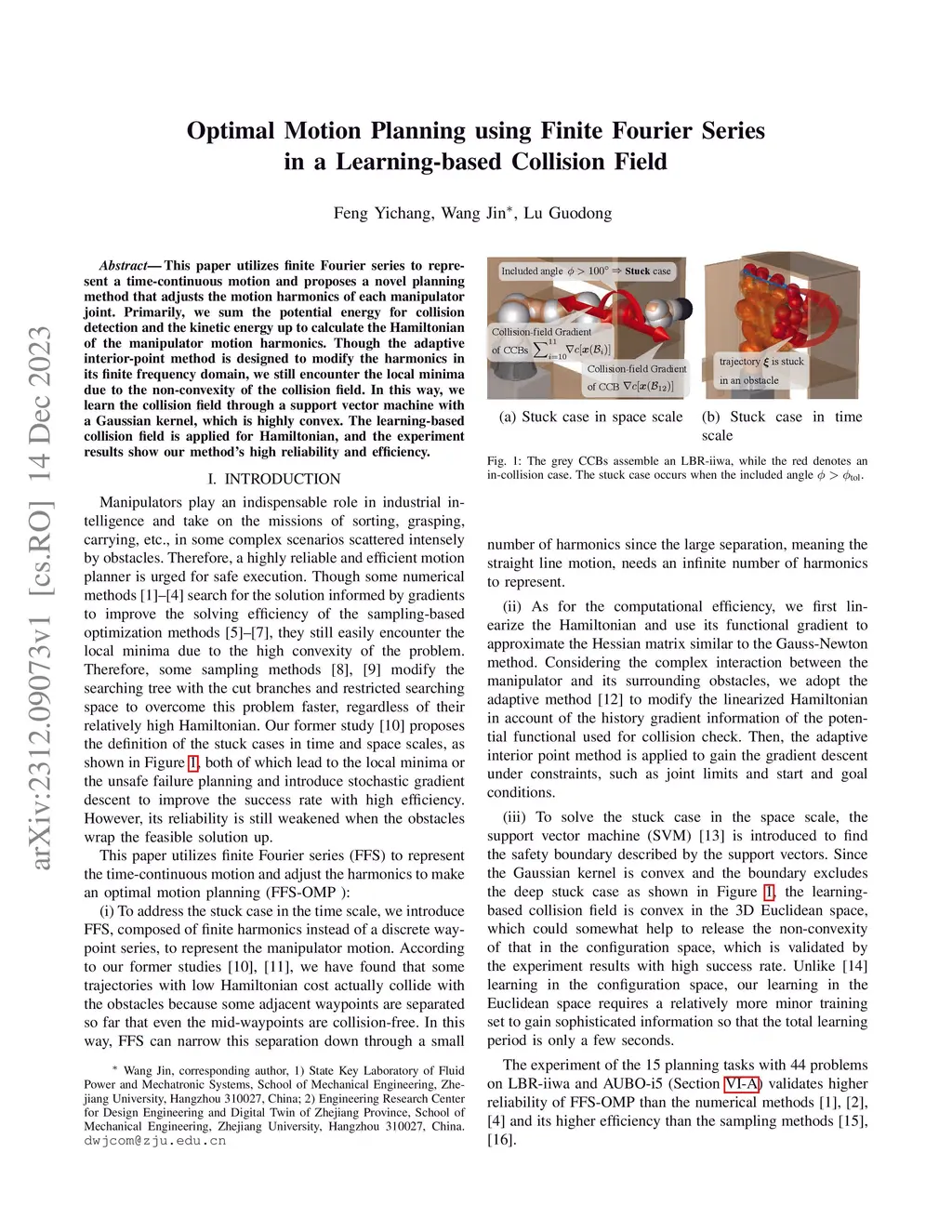 This paper utilizes finite Fourier series to represent a time-continuous motion and proposes a novel planning method that adjusts the motion harmonics of each manipulator joint. Primarily, we sum the potential energy for collision detection and the kinetic energy up to calculate the Hamiltonian of the manipulator motion harmonics. Though the adaptive interior-point method is designed to modify the harmonics in its finite frequency domain, we still encounter the local minima due to the non-convexity of the collision field. In this way, we learn the collision field through a support vector machine with a Gaussian kernel, which is highly convex. The learning-based collision field is applied for Hamiltonian, and the experiment results show our method's high reliability and efficiency.