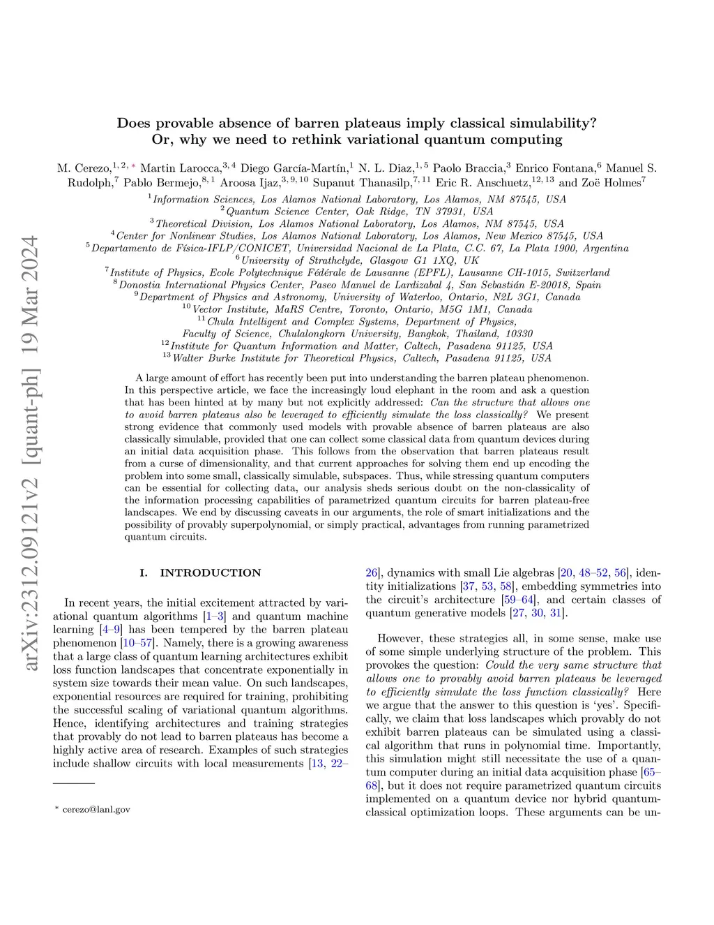 A large amount of effort has recently been put into understanding the barren plateau phenomenon. In this perspective article, we face the increasingly loud elephant in the room and ask a question that has been hinted at by many but not explicitly addressed: Can the structure that allows one to avoid barren plateaus also be leveraged to efficiently simulate the loss classically? We collect evidence-on a case-by-case basis-that many commonly used models whose loss landscapes avoid barren plateaus can also admit classical simulation, provided that one can collect some classical data from quantum devices during an initial data acquisition phase. This follows from the observation that barren plateaus result from a curse of dimensionality, and that current approaches for solving them end up encoding the problem into some small, classically simulable, subspaces. Thus, while stressing that quantum computers can be essential for collecting data, our analysis sheds doubt on the information processing capabilities of many parametrized quantum circuits with provably barren plateau-free landscapes. We end by discussing the (many) caveats in our arguments including the limitations of average case arguments, the role of smart initializations, models that fall outside our assumptions, the potential for provably superpolynomial advantages and the possibility that, once larger devices become available, parametrized quantum circuits could heuristically outperform our analytic expectations.