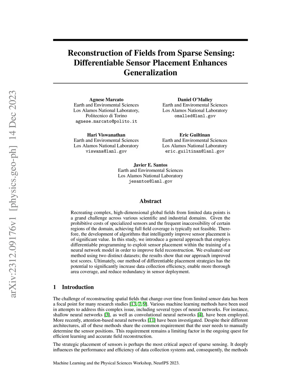 Reconstruction of Fields from Sparse Sensing: Differentiable Sensor