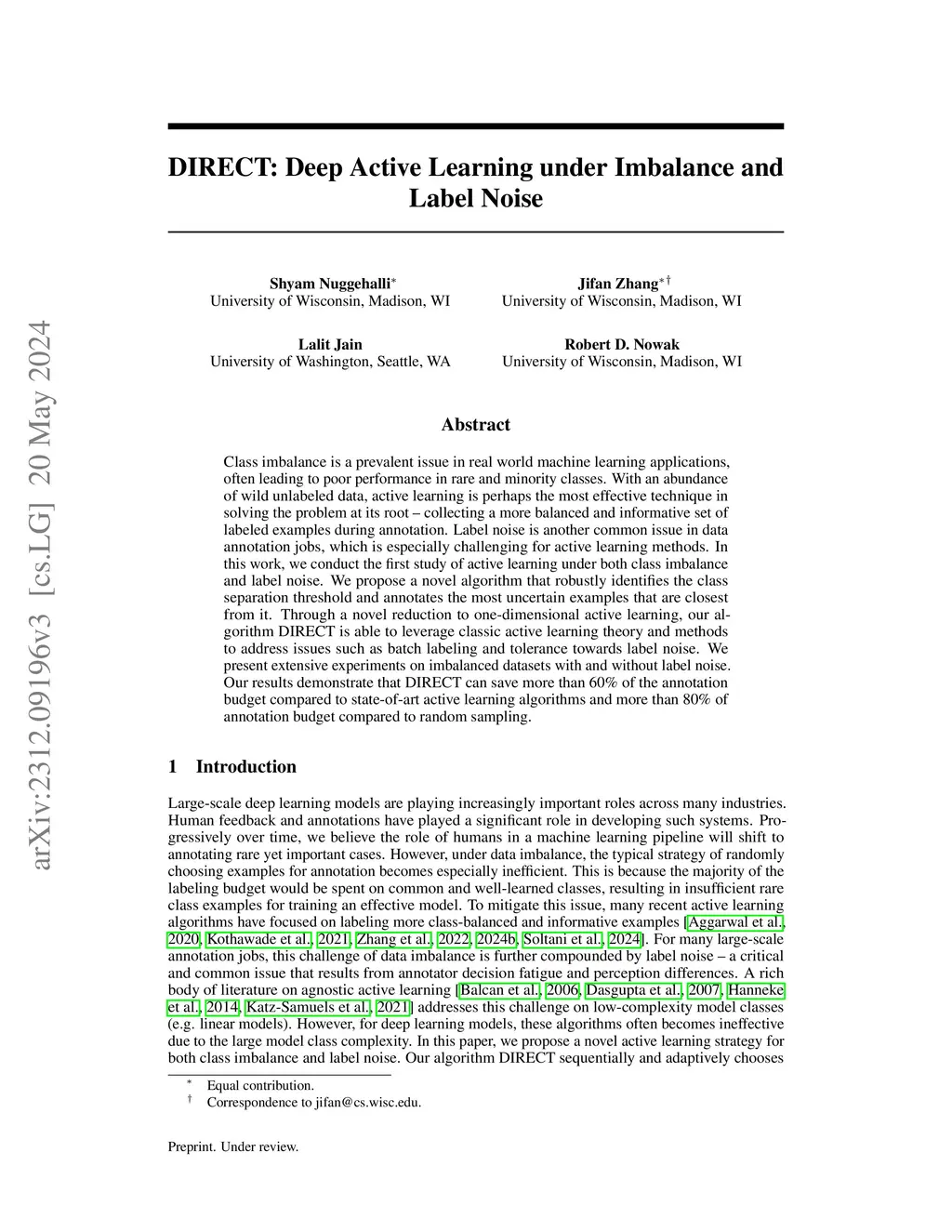 Class imbalance severely impacts machine learning performance on minority classes in real-world applications. While various solutions exist, active learning offers a fundamental fix by strategically collecting balanced, informative labeled examples from abundant unlabeled data. We introduce DIRECT, an algorithm that identifies class separation boundaries and selects the most uncertain nearby examples for annotation. By reducing the problem to one-dimensional active learning, DIRECT leverages established theory to handle batch labeling and label noise -- another common challenge in data annotation that particularly affects active learning methods. Our work presents the first comprehensive study of active learning under both class imbalance and label noise. Extensive experiments on imbalanced datasets show DIRECT reduces annotation costs by over 60\% compared to state-of-the-art active learning methods and over 80\% versus random sampling, while maintaining robustness to label noise.
