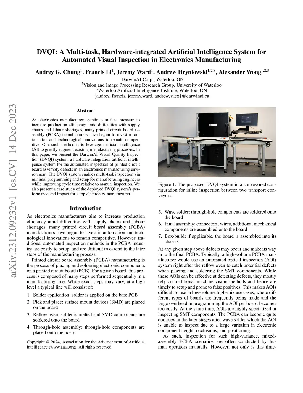 As electronics manufacturers continue to face pressure to increase production efficiency amid difficulties with supply chains and labour shortages, many printed circuit board assembly (PCBA) manufacturers have begun to invest in automation and technological innovations to remain competitive. One such method is to leverage artificial intelligence (AI) to greatly augment existing manufacturing processes. In this paper, we present the DarwinAI Visual Quality Inspection (DVQI) system, a hardware-integration artificial intelligence system for the automated inspection of printed circuit board assembly defects in an electronics manufacturing environment. The DVQI system enables multi-task inspection via minimal programming and setup for manufacturing engineers while improving cycle time relative to manual inspection. We also present a case study of the deployed DVQI system's performance and impact for a top electronics manufacturer.