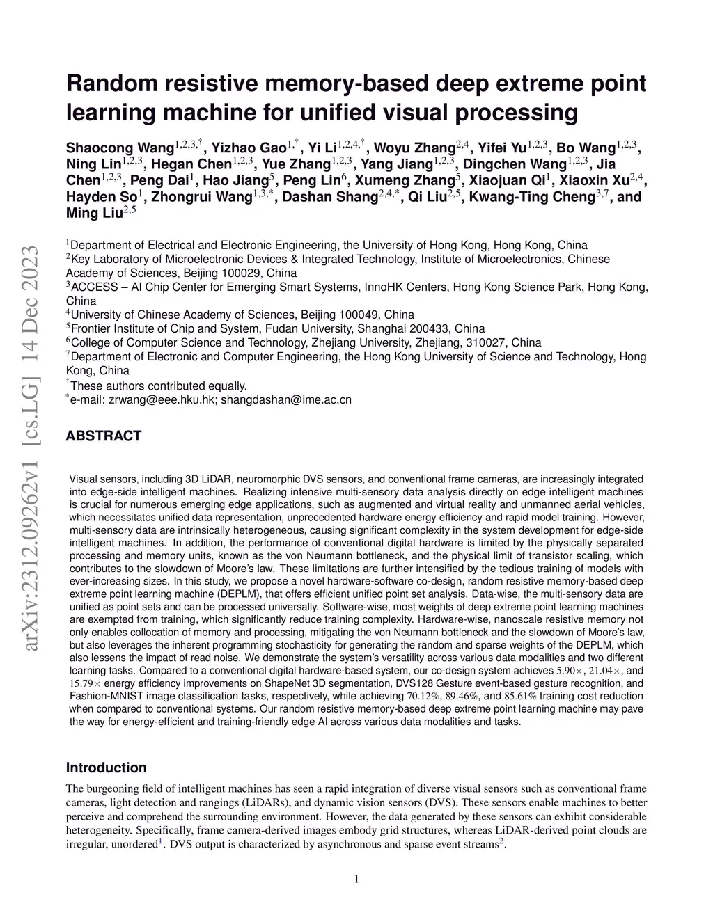Visual sensors, including 3D LiDAR, neuromorphic DVS sensors, and conventional frame cameras, are increasingly integrated into edge-side intelligent machines. Realizing intensive multi-sensory data analysis directly on edge intelligent machines is crucial for numerous emerging edge applications, such as augmented and virtual reality and unmanned aerial vehicles, which necessitates unified data representation, unprecedented hardware energy efficiency and rapid model training. However, multi-sensory data are intrinsically heterogeneous, causing significant complexity in the system development for edge-side intelligent machines. In addition, the performance of conventional digital hardware is limited by the physically separated processing and memory units, known as the von Neumann bottleneck, and the physical limit of transistor scaling, which contributes to the slowdown of Moore's law. These limitations are further intensified by the tedious training of models with ever-increasing sizes. We propose a novel hardware-software co-design, random resistive memory-based deep extreme point learning machine (DEPLM), that offers efficient unified point set analysis. We show the system's versatility across various data modalities and two different learning tasks. Compared to a conventional digital hardware-based system, our co-design system achieves huge energy efficiency improvements and training cost reduction when compared to conventional systems. Our random resistive memory-based deep extreme point learning machine may pave the way for energy-efficient and training-friendly edge AI across various data modalities and tasks.