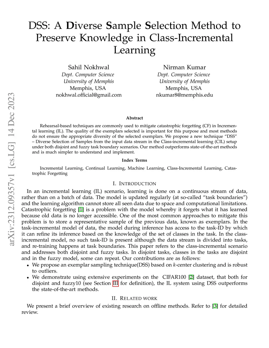 Rehearsal-based techniques are commonly used to mitigate catastrophic forgetting (CF) in Incremental learning (IL). The quality of the exemplars selected is important for this purpose and most methods do not ensure the appropriate diversity of the selected exemplars. We propose a new technique "DSS" -- Diverse Selection of Samples from the input data stream in the Class-incremental learning (CIL) setup under both disjoint and fuzzy task boundary scenarios. Our method outperforms state-of-the-art methods and is much simpler to understand and implement.