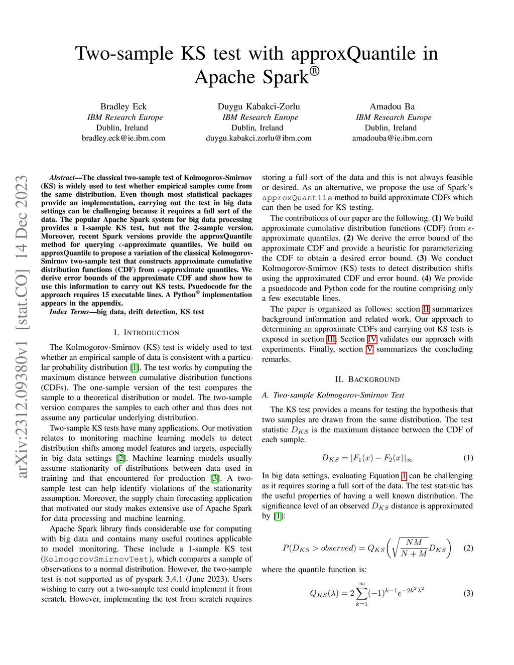 The classical two-sample test of Kolmogorov-Smirnov (KS) is widely used to test whether empirical samples come from the same distribution. Even though most statistical packages provide an implementation, carrying out the test in big data settings can be challenging because it requires a full sort of the data. The popular Apache Spark system for big data processing provides a 1-sample KS test, but not the 2-sample version. Moreover, recent Spark versions provide the approxQuantile method for querying -approximate quantiles. We build on approxQuantile to propose a variation of the classical Kolmogorov-Smirnov two-sample test that constructs approximate cumulative distribution functions (CDF) from -approximate quantiles. We derive error bounds of the approximate CDF and show how to use this information to carry out KS tests. Psuedocode for the approach requires 15 executable lines. A Python implementation appears in the appendix.