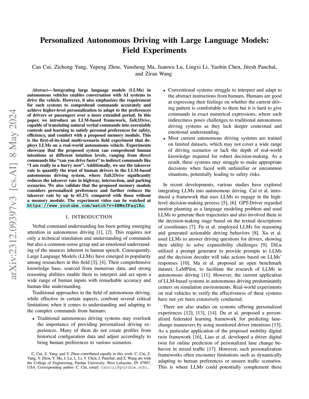 Integrating large language models (LLMs) in autonomous vehicles enables conversation with AI systems to drive the vehicle. However, it also emphasizes the requirement for such systems to comprehend commands accurately and achieve higher-level personalization to adapt to the preferences of drivers or passengers over a more extended period. In this paper, we introduce an LLM-based framework, Talk2Drive, capable of translating natural verbal commands into executable controls and learning to satisfy personal preferences for safety, efficiency, and comfort with a proposed memory module. This is the first-of-its-kind multi-scenario field experiment that deploys LLMs on a real-world autonomous vehicle. Experiments showcase that the proposed system can comprehend human intentions at different intuition levels, ranging from direct commands like "can you drive faster" to indirect commands like "I am really in a hurry now". Additionally, we use the takeover rate to quantify the trust of human drivers in the LLM-based autonomous driving system, where Talk2Drive significantly reduces the takeover rate in highway, intersection, and parking scenarios. We also validate that the proposed memory module considers personalized preferences and further reduces the takeover rate by up to 65.2% compared with those without a memory module. The experiment video can be watched at https://www.youtube.com/watch?v=4BWsfPaq1Ro