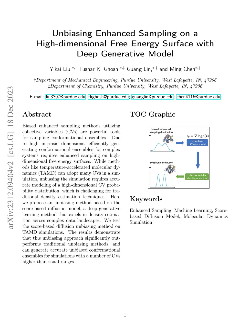 Biased enhanced sampling methods utilizing collective variables (CVs) are powerful tools for sampling conformational ensembles. Due to high intrinsic dimensions, efficiently generating conformational ensembles for complex systems requires enhanced sampling on high-dimensional free energy surfaces. While methods like temperature-accelerated molecular dynamics (TAMD) can adopt many CVs in a simulation, unbiasing the simulation requires accurate modeling of a high-dimensional CV probability distribution, which is challenging for traditional density estimation techniques. Here we propose an unbiasing method based on the score-based diffusion model, a deep generative learning method that excels in density estimation across complex data landscapes. We test the score-based diffusion unbiasing method on TAMD simulations. The results demonstrate that this unbiasing approach significantly outperforms traditional unbiasing methods, and can generate accurate unbiased conformational ensembles for simulations with a number of CVs higher than usual ranges.