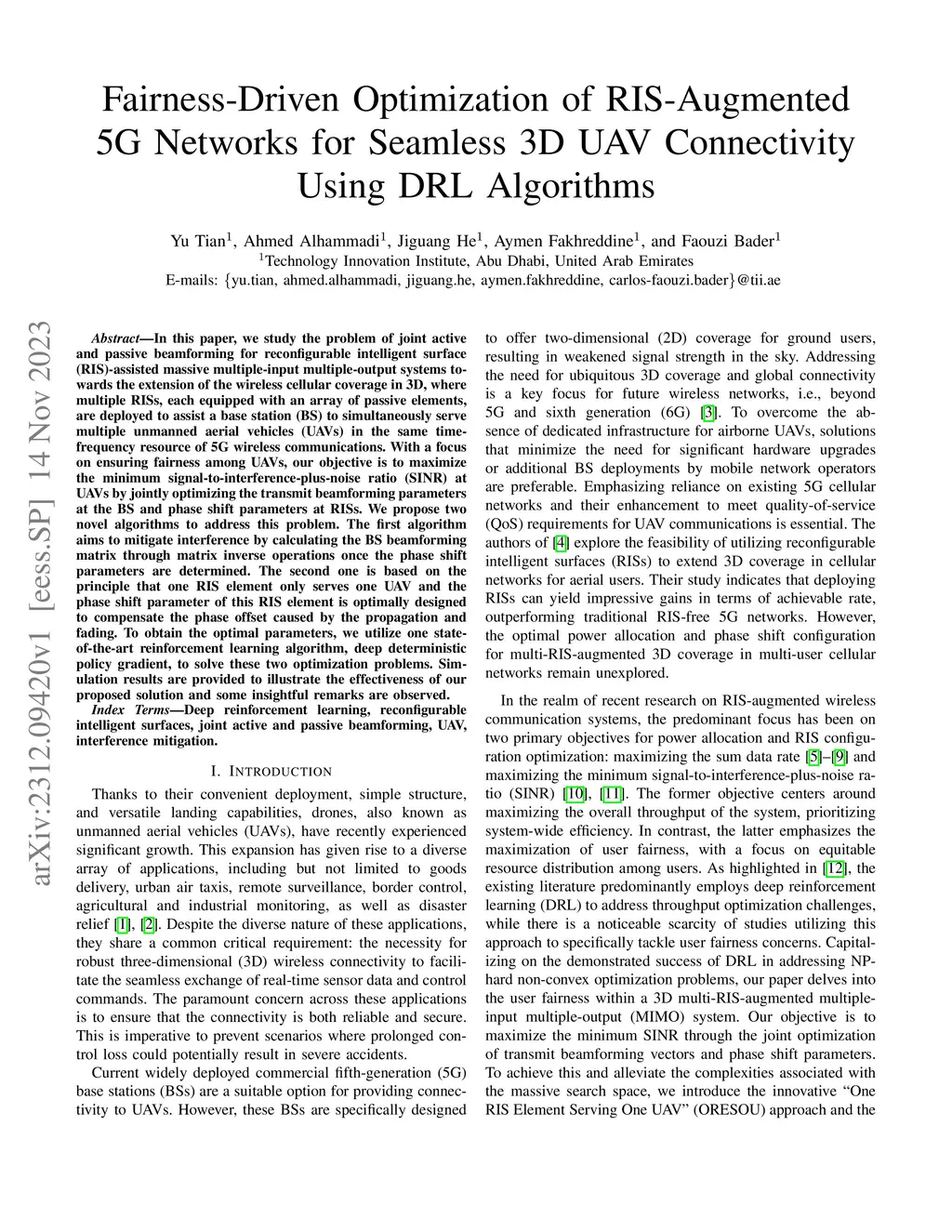 In this paper, we study the problem of joint active and passive beamforming for reconfigurable intelligent surface (RIS)-assisted massive multiple-input multiple-output systems towards the extension of the wireless cellular coverage in 3D, where multiple RISs, each equipped with an array of passive elements, are deployed to assist a base station (BS) to simultaneously serve multiple unmanned aerial vehicles (UAVs) in the same time-frequency resource of 5G wireless communications. With a focus on ensuring fairness among UAVs, our objective is to maximize the minimum signal-to-interference-plus-noise ratio (SINR) at UAVs by jointly optimizing the transmit beamforming parameters at the BS and phase shift parameters at RISs. We propose two novel algorithms to address this problem. The first algorithm aims to mitigate interference by calculating the BS beamforming matrix through matrix inverse operations once the phase shift parameters are determined. The second one is based on the principle that one RIS element only serves one UAV and the phase shift parameter of this RIS element is optimally designed to compensate the phase offset caused by the propagation and fading. To obtain the optimal parameters, we utilize one state-of-the-art reinforcement learning algorithm, deep deterministic policy gradient, to solve these two optimization problems. Simulation results are provided to illustrate the effectiveness of our proposed solution and some insightful remarks are observed.
