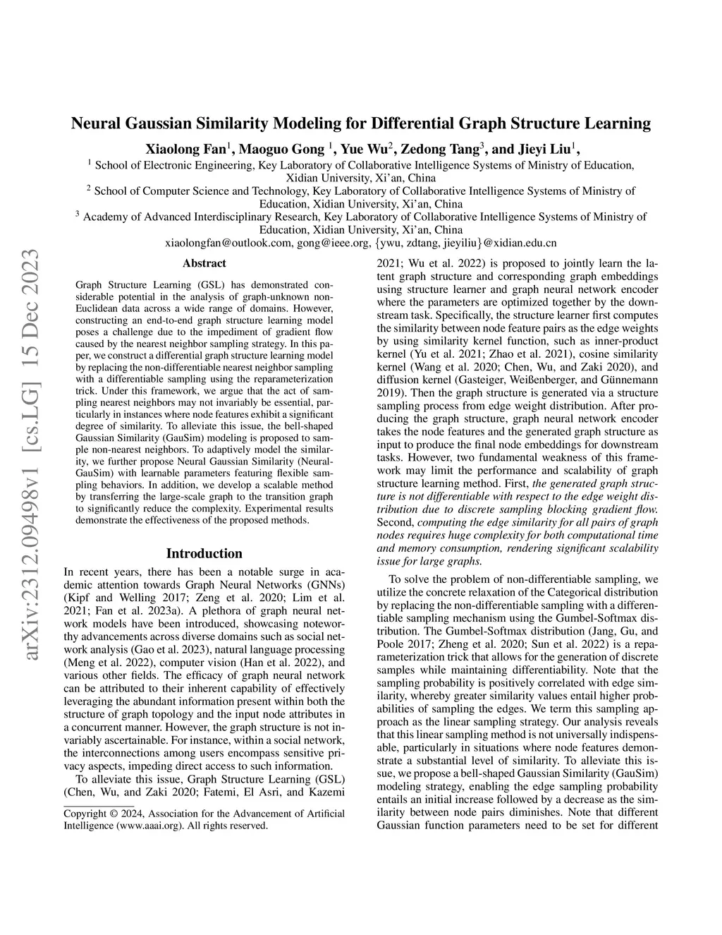 Graph Structure Learning (GSL) has demonstrated considerable potential in the analysis of graph-unknown non-Euclidean data across a wide range of domains. However, constructing an end-to-end graph structure learning model poses a challenge due to the impediment of gradient flow caused by the nearest neighbor sampling strategy. In this paper, we construct a differential graph structure learning model by replacing the non-differentiable nearest neighbor sampling with a differentiable sampling using the reparameterization trick. Under this framework, we argue that the act of sampling \mbox{nearest} neighbors may not invariably be essential, particularly in instances where node features exhibit a significant degree of similarity. To alleviate this issue, the bell-shaped Gaussian Similarity (GauSim) modeling is proposed to sample non-nearest neighbors. To adaptively model the similarity, we further propose Neural Gaussian Similarity (NeuralGauSim) with learnable parameters featuring flexible sampling behaviors. In addition, we develop a scalable method by transferring the large-scale graph to the transition graph to significantly reduce the complexity. Experimental results demonstrate the effectiveness of the proposed methods.