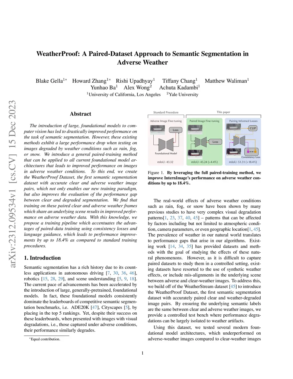 The introduction of large, foundational models to computer vision has led to drastically improved performance on the task of semantic segmentation. However, these existing methods exhibit a large performance drop when testing on images degraded by weather conditions such as rain, fog, or snow. We introduce a general paired-training method that can be applied to all current foundational model architectures that leads to improved performance on images in adverse weather conditions. To this end, we create the WeatherProof Dataset, the first semantic segmentation dataset with accurate clear and adverse weather image pairs, which not only enables our new training paradigm, but also improves the evaluation of the performance gap between clear and degraded segmentation. We find that training on these paired clear and adverse weather frames which share an underlying scene results in improved performance on adverse weather data. With this knowledge, we propose a training pipeline which accentuates the advantages of paired-data training using consistency losses and language guidance, which leads to performance improvements by up to 18.4% as compared to standard training procedures.