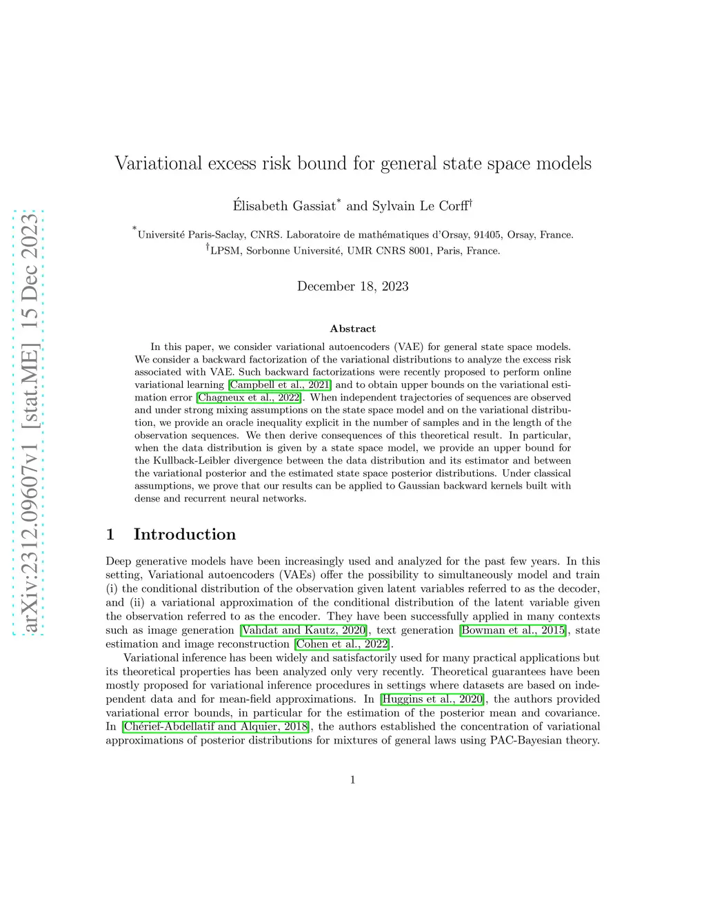 In this paper, we consider variational autoencoders (VAE) for general state space models. We consider a backward factorization of the variational distributions to analyze the excess risk associated with VAE. Such backward factorizations were recently proposed to perform online variational learning and to obtain upper bounds on the variational estimation error. When independent trajectories of sequences are observed and under strong mixing assumptions on the state space model and on the variational distribution, we provide an oracle inequality explicit in the number of samples and in the length of the observation sequences. We then derive consequences of this theoretical result. In particular, when the data distribution is given by a state space model, we provide an upper bound for the Kullback-Leibler divergence between the data distribution and its estimator and between the variational posterior and the estimated state space posterior distributions.Under classical assumptions, we prove that our results can be applied to Gaussian backward kernels built with dense and recurrent neural networks.