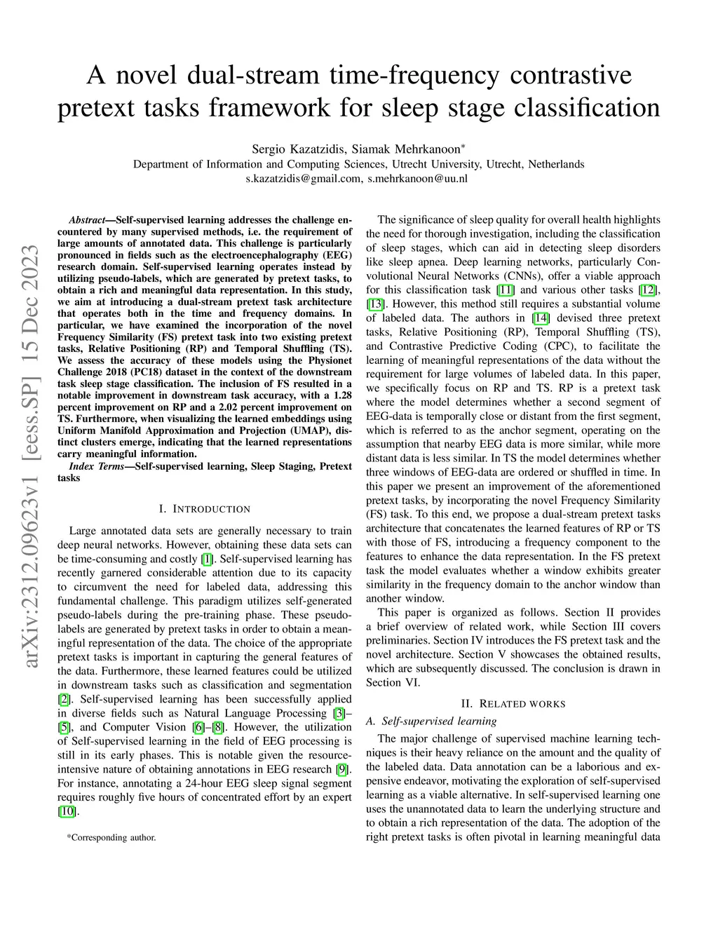 Self-supervised learning addresses the challenge encountered by many supervised methods, i.e. the requirement of large amounts of annotated data. This challenge is particularly pronounced in fields such as the electroencephalography (EEG) research domain. Self-supervised learning operates instead by utilizing pseudo-labels, which are generated by pretext tasks, to obtain a rich and meaningful data representation. In this study, we aim at introducing a dual-stream pretext task architecture that operates both in the time and frequency domains. In particular, we have examined the incorporation of the novel Frequency Similarity (FS) pretext task into two existing pretext tasks, Relative Positioning (RP) and Temporal Shuffling (TS). We assess the accuracy of these models using the Physionet Challenge 2018 (PC18) dataset in the context of the downstream task sleep stage classification. The inclusion of FS resulted in a notable improvement in downstream task accuracy, with a 1.28 percent improvement on RP and a 2.02 percent improvement on TS. Furthermore, when visualizing the learned embeddings using Uniform Manifold Approximation and Projection (UMAP), distinct clusters emerge, indicating that the learned representations carry meaningful information.