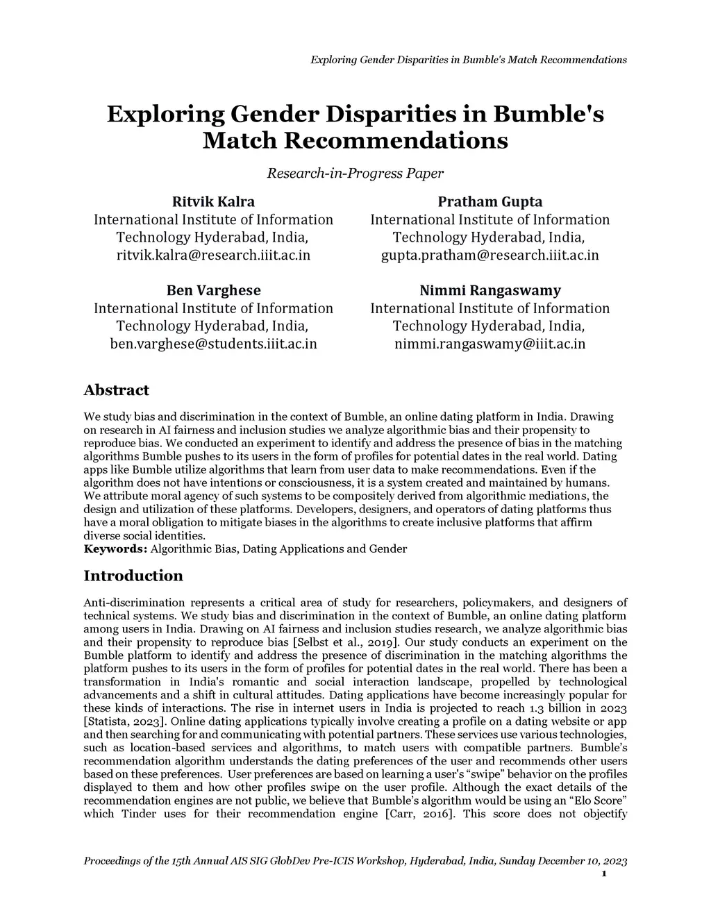 We study bias and discrimination in the context of Bumble, an online dating platform in India. Drawing on research in AI fairness and inclusion studies we analyze algorithmic bias and their propensity to reproduce bias. We conducted an experiment to identify and address the presence of bias in the matching algorithms Bumble pushes to its users in the form of profiles for potential dates in the real world. Dating apps like Bumble utilize algorithms that learn from user data to make recommendations. Even if the algorithm does not have intentions or consciousness, it is a system created and maintained by humans. We attribute moral agency of such systems to be compositely derived from algorithmic mediations, the design and utilization of these platforms. Developers, designers, and operators of dating platforms thus have a moral obligation to mitigate biases in the algorithms to create inclusive platforms that affirm diverse social identities.