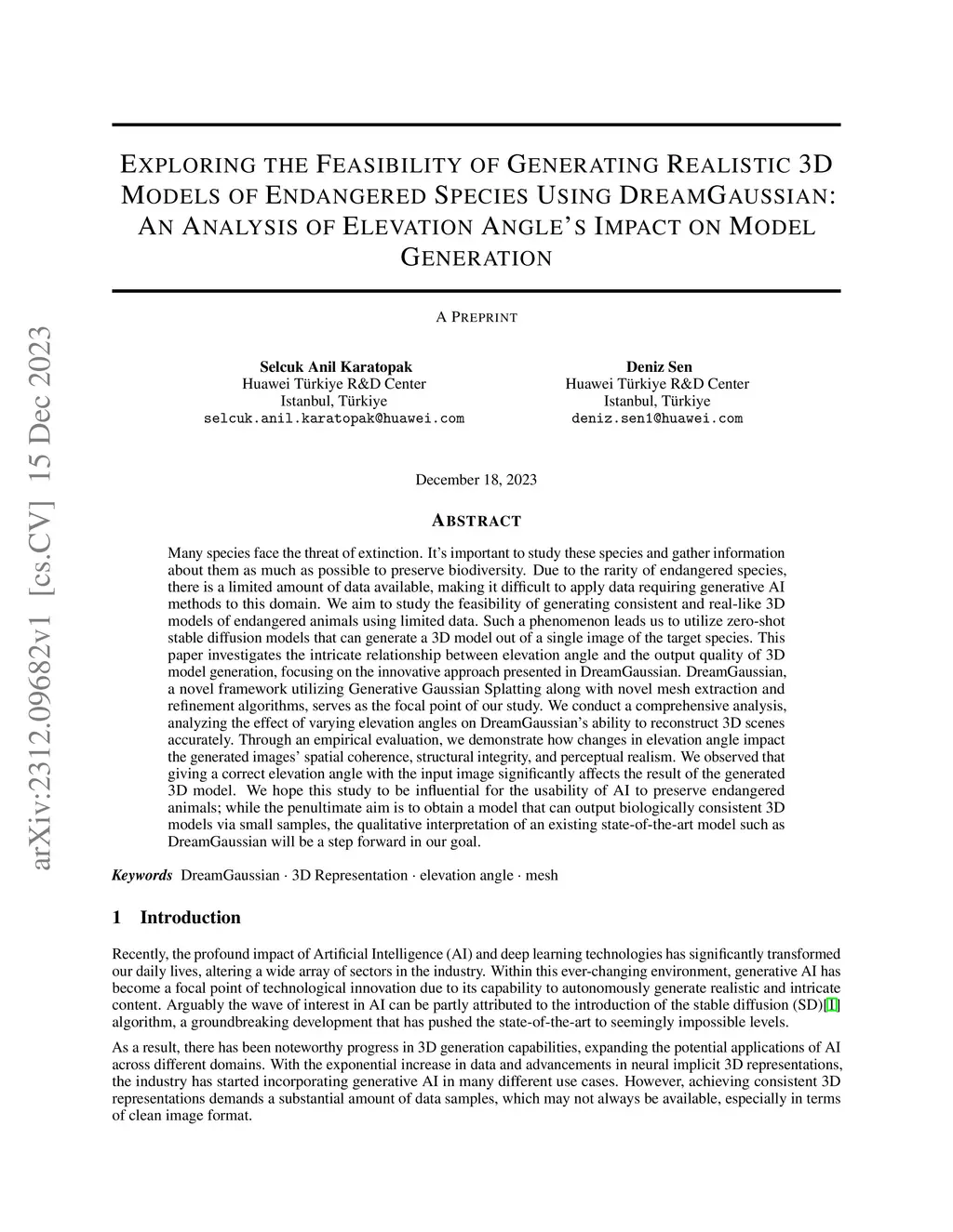 Many species face the threat of extinction. It's important to study these species and gather information about them as much as possible to preserve biodiversity. Due to the rarity of endangered species, there is a limited amount of data available, making it difficult to apply data requiring generative AI methods to this domain. We aim to study the feasibility of generating consistent and real-like 3D models of endangered animals using limited data. Such a phenomenon leads us to utilize zero-shot stable diffusion models that can generate a 3D model out of a single image of the target species. This paper investigates the intricate relationship between elevation angle and the output quality of 3D model generation, focusing on the innovative approach presented in DreamGaussian. DreamGaussian, a novel framework utilizing Generative Gaussian Splatting along with novel mesh extraction and refinement algorithms, serves as the focal point of our study. We conduct a comprehensive analysis, analyzing the effect of varying elevation angles on DreamGaussian's ability to reconstruct 3D scenes accurately. Through an empirical evaluation, we demonstrate how changes in elevation angle impact the generated images' spatial coherence, structural integrity, and perceptual realism. We observed that giving a correct elevation angle with the input image significantly affects the result of the generated 3D model. We hope this study to be influential for the usability of AI to preserve endangered animals; while the penultimate aim is to obtain a model that can output biologically consistent 3D models via small samples, the qualitative interpretation of an existing state-of-the-art model such as DreamGaussian will be a step forward in our goal.