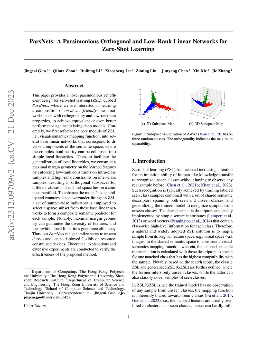 This paper provides a novel parsimonious yet efficient design for zero-shot learning (ZSL), dubbed ParsNets, where we are interested in learning a composition of on-device friendly linear networks, each with orthogonality and low-rankness properties, to achieve equivalent or even better performance against existing deep models. Concretely, we first refactor the core module of ZSL, i.e., visual-semantics mapping function, into several base linear networks that correspond to diverse components of the semantic space, where the complex nonlinearity can be collapsed into simple local linearities. Then, to facilitate the generalization of local linearities, we construct a maximal margin geometry on the learned features by enforcing low-rank constraints on intra-class samples and high-rank constraints on inter-class samples, resulting in orthogonal subspaces for different classes and each subspace lies on a compact manifold. To enhance the model's adaptability and counterbalance over/under-fittings in ZSL, a set of sample-wise indicators is employed to select a sparse subset from these base linear networks to form a composite semantic predictor for each sample. Notably, maximal margin geometry can guarantee the diversity of features, and meanwhile, local linearities guarantee efficiency. Thus, our ParsNets can generalize better to unseen classes and can be deployed flexibly on resource-constrained devices. Theoretical explanations and extensive experiments are conducted to verify the effectiveness of the proposed method.
