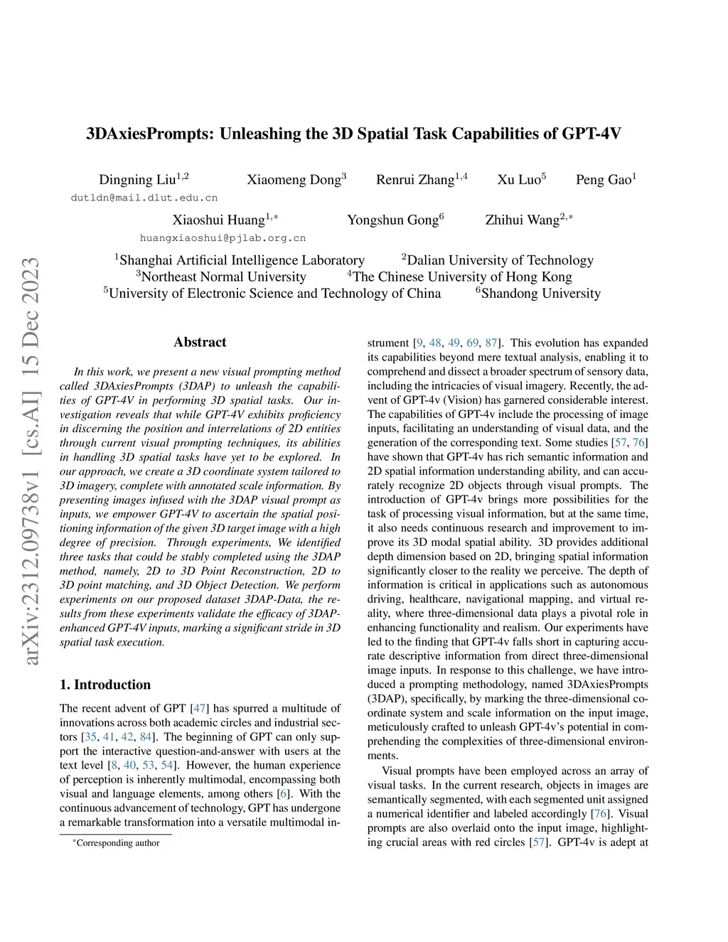 In this work, we present a new visual prompting method called 3DAxiesPrompts (3DAP) to unleash the capabilities of GPT-4V in performing 3D spatial tasks. Our investigation reveals that while GPT-4V exhibits proficiency in discerning the position and interrelations of 2D entities through current visual prompting techniques, its abilities in handling 3D spatial tasks have yet to be explored. In our approach, we create a 3D coordinate system tailored to 3D imagery, complete with annotated scale information. By presenting images infused with the 3DAP visual prompt as inputs, we empower GPT-4V to ascertain the spatial positioning information of the given 3D target image with a high degree of precision. Through experiments, We identified three tasks that could be stably completed using the 3DAP method, namely, 2D to 3D Point Reconstruction, 2D to 3D point matching, and 3D Object Detection. We perform experiments on our proposed dataset 3DAP-Data, the results from these experiments validate the efficacy of 3DAP-enhanced GPT-4V inputs, marking a significant stride in 3D spatial task execution.