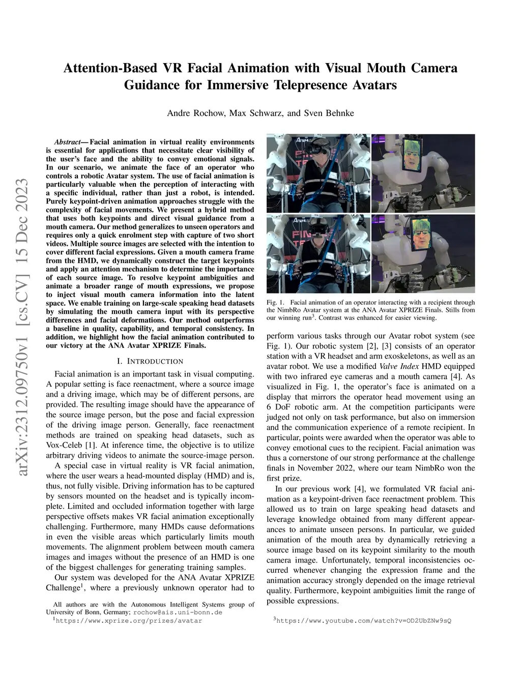 Facial animation in virtual reality environments is essential for applications that necessitate clear visibility of the user's face and the ability to convey emotional signals. In our scenario, we animate the face of an operator who controls a robotic Avatar system. The use of facial animation is particularly valuable when the perception of interacting with a specific individual, rather than just a robot, is intended. Purely keypoint-driven animation approaches struggle with the complexity of facial movements. We present a hybrid method that uses both keypoints and direct visual guidance from a mouth camera. Our method generalizes to unseen operators and requires only a quick enrolment step with capture of two short videos. Multiple source images are selected with the intention to cover different facial expressions. Given a mouth camera frame from the HMD, we dynamically construct the target keypoints and apply an attention mechanism to determine the importance of each source image. To resolve keypoint ambiguities and animate a broader range of mouth expressions, we propose to inject visual mouth camera information into the latent space. We enable training on large-scale speaking head datasets by simulating the mouth camera input with its perspective differences and facial deformations. Our method outperforms a baseline in quality, capability, and temporal consistency. In addition, we highlight how the facial animation contributed to our victory at the ANA Avatar XPRIZE Finals.