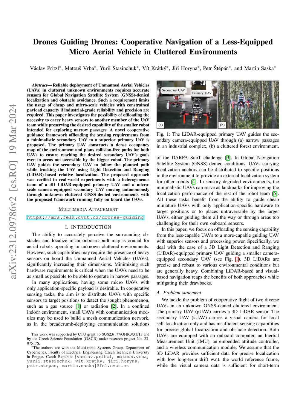 Reliable deployment of Unmanned Aerial Vehicles (UAVs) in cluttered unknown environments requires accurate sensors for Global Navigation Satellite System (GNSS)-denied localization and obstacle avoidance. Such a requirement limits the usage of cheap and micro-scale vehicles with constrained payload capacity if industrial-grade reliability and precision are required. This paper investigates the possibility of offloading the necessity to carry heavy sensors to another member of the UAV team while preserving the desired capability of the smaller robot intended for exploring narrow passages. A novel cooperative guidance framework offloading the sensing requirements from a minimalistic secondary UAV to a superior primary UAV is proposed. The primary UAV constructs a dense occupancy map of the environment and plans collision-free paths for both UAVs to ensure reaching the desired secondary UAV's goals even in areas not accessible by the bigger robot. The primary UAV guides the secondary UAV to follow the planned path while tracking the UAV using Light Detection and Ranging (LiDAR)-based relative localization. The proposed approach was verified in real-world experiments with a heterogeneous team of a 3D LiDAR-equipped primary UAV and a micro-scale camera-equipped secondary UAV moving autonomously through unknown cluttered GNSS-denied environments with the proposed framework running fully on board the UAVs.