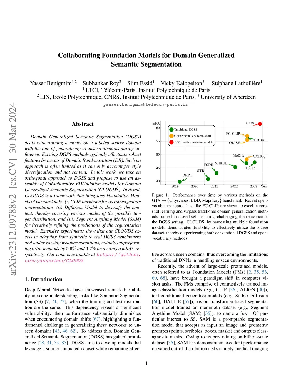 Domain Generalized Semantic Segmentation (DGSS) deals with training a model on a labeled source domain with the aim of generalizing to unseen domains during inference. Existing DGSS methods typically effectuate robust features by means of Domain Randomization (DR). Such an approach is often limited as it can only account for style diversification and not content. In this work, we take an orthogonal approach to DGSS and propose to use an assembly of CoLlaborative FOUndation models for Domain Generalized Semantic Segmentation (CLOUDS). In detail, CLOUDS is a framework that integrates FMs of various kinds: (i) CLIP backbone for its robust feature representation, (ii) generative models to diversify the content, thereby covering various modes of the possible target distribution, and (iii) Segment Anything Model (SAM) for iteratively refining the predictions of the segmentation model. Extensive experiments show that our CLOUDS excels in adapting from synthetic to real DGSS benchmarks and under varying weather conditions, notably outperforming prior methods by 5.6% and 6.7% on averaged miou, respectively. The code is available at : https://github.com/yasserben/CLOUDS