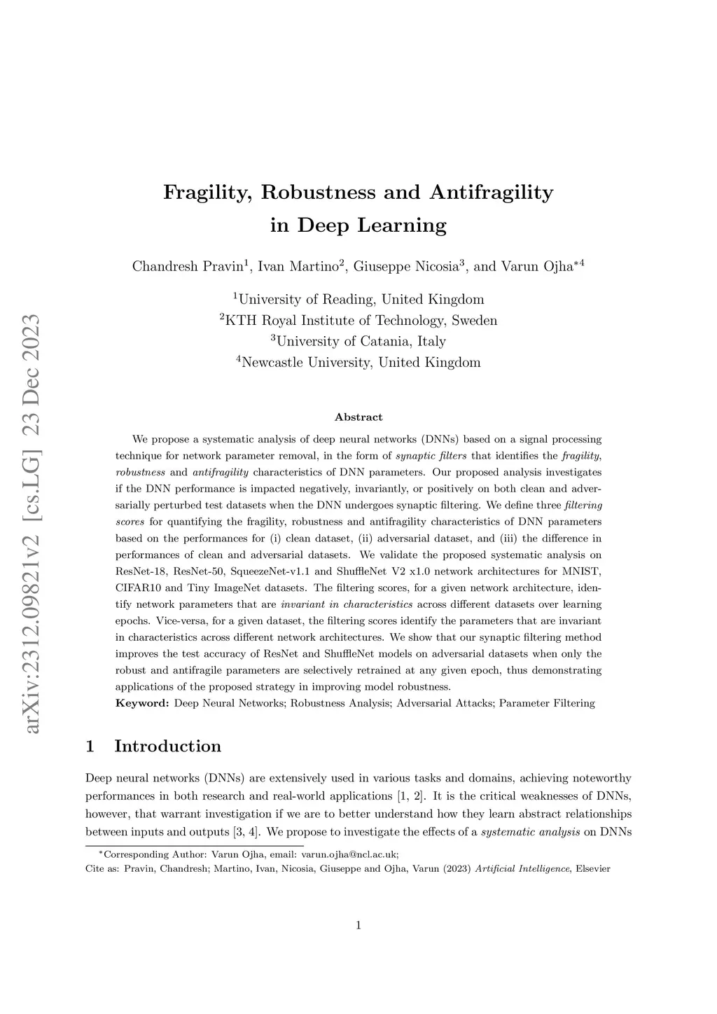 We propose a systematic analysis of deep neural networks (DNNs) based on a signal processing technique for network parameter removal, in the form of synaptic filters that identifies the fragility, robustness and antifragility characteristics of DNN parameters. Our proposed analysis investigates if the DNN performance is impacted negatively, invariantly, or positively on both clean and adversarially perturbed test datasets when the DNN undergoes synaptic filtering. We define three \textit{filtering scores} for quantifying the fragility, robustness and antifragility characteristics of DNN parameters based on the performances for (i) clean dataset, (ii) adversarial dataset, and (iii) the difference in performances of clean and adversarial datasets. We validate the proposed systematic analysis on ResNet-18, ResNet-50, SqueezeNet-v1.1 and ShuffleNet V2 x1.0 network architectures for MNIST, CIFAR10 and Tiny ImageNet datasets. The filtering scores, for a given network architecture, identify network parameters that are invariant in characteristics across different datasets over learning epochs. Vice-versa, for a given dataset, the filtering scores identify the parameters that are invariant in characteristics across different network architectures. We show that our synaptic filtering method improves the test accuracy of ResNet and ShuffleNet models on adversarial datasets when only the robust and antifragile parameters are selectively retrained at any given epoch, thus demonstrating applications of the proposed strategy in improving model robustness.