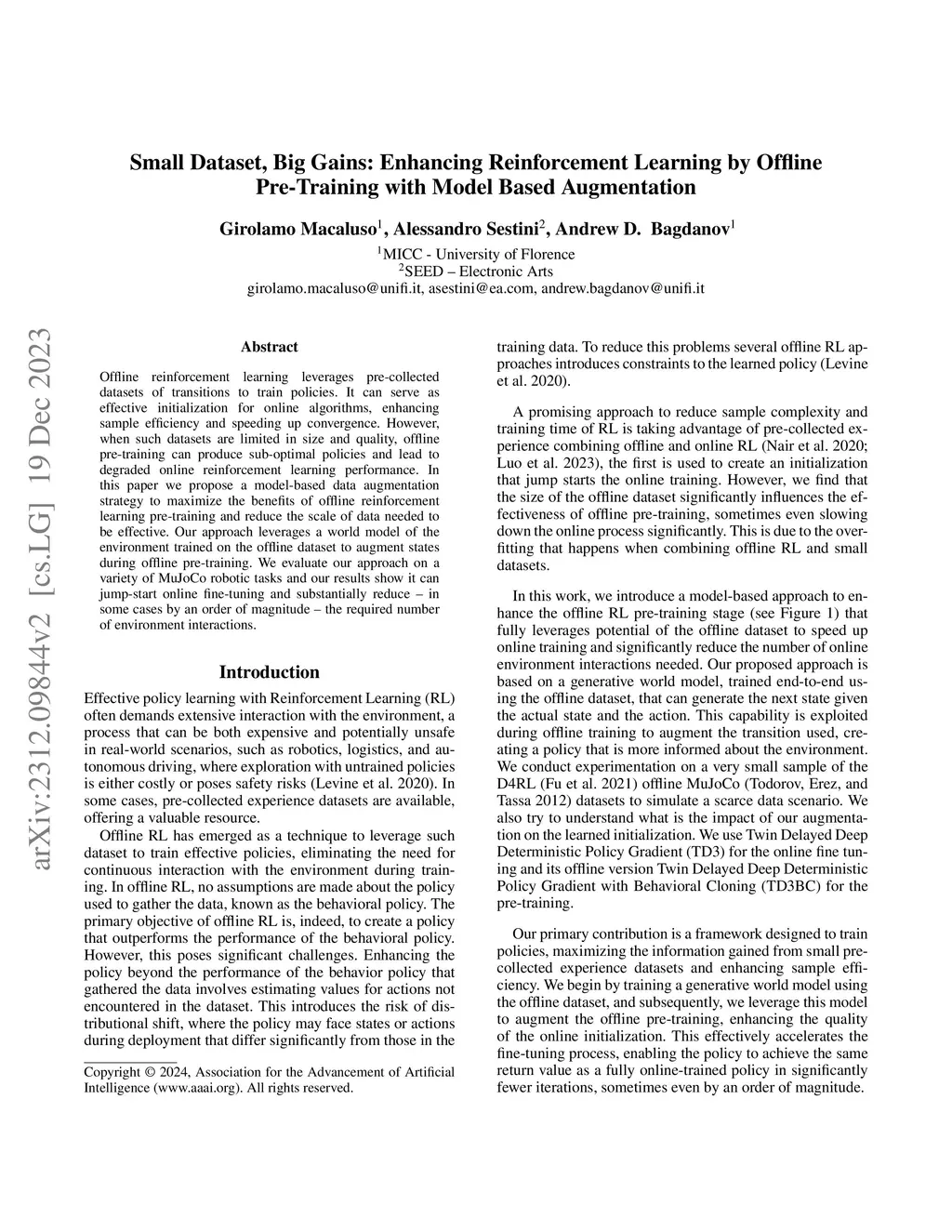 Small Dataset, Big Gains: Enhancing Reinforcement Learning by Offline Pre-Training with Model Based Augmentation